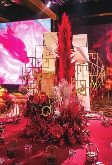 作品运用中国红来表达传统,采用欧式花艺表现时尚感,结合大型架构来体现整体的喜庆氛围。