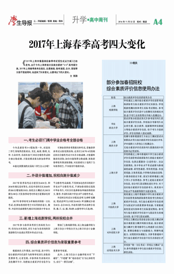 《2017年上海市普通高校春季考试招生试点方案》已经发布,由于今年上海将首次实施全新的“3+3”高考新方案,2017年上海春季高考在报名、志愿填报、报考流程、总分、录取等方面不变的同时,也迎来了许多变化,主要有以下四大变化。 文 郭漪 一、考生必须7门高中学业合格考全部合格 今年是新高考3+3落地第一年,应届高三学生须取得思想政治、历史、地理、物理、化学、生命科学、信息科技7门科目合格性考试的全部合格成绩,才能按要求报名参加春季高考。 未能达到要求的应届高三学生怎么办呢? 可参加春季高考预报名和考试,若被春季高考试点院校预录取,还须在2017年4月的相应科目合格性考试中补齐合格成绩,才能最终被高校录取;如仍未能取得合格成绩,则取消春季高考预录取资格,对应的招生计划用于当年秋季招生,不在春招中继续补录。 二、外语分值增加,院校自测分值减少 2017年春季高考总分值仍为600分,和2016年相比没有变化,但是外语科目从2016年的100分增加到150分,院校自主测试从200分降为150分,可见春季高考对外语方面要求有所提高。 2017年春季高考为单独组织的统一文化考试,但参加春招的考生可以用春招语文、数学、外语科目成绩替代相应科目的高中学业水平合格性考试成绩,不再参加这些科目的高中学业水平合格性考试。不参加春招的应届高中毕业考生,可以另行选择参加单独组卷的语文、数学、外语科目高中学业水平合格性考试。 外语科目考试分为笔试(含听力)和听说测试,笔试(含听力)分值为140分,听说测试分值为10分,总分150分。外语科目的考试语种分设英、俄、日、法、德、西6种,由报考学生任选1种。 三、新增上海戏剧学院,两所院校合并 2017年参与春季高考招生的高校为23所,仍均为本科高校,招生专业为各高校的国家级特色专业或应用型本科试点专业。 增加了上海戏剧学院,而上海金融学院与上海立信会计学院合并为上海立信会计金融学院。 四、综合素质评价信息为录取重要参考 根据相关文件要求,2017年起,高中学生综合素质评价信息作为高等学校招生录取的重要参考。记者发现,在春季高考录取时以及校测环节中,均把综合素质评价信息作为重要参考依据。 此外,上海立信会计金融学院对有“不诚信”、“不道德”和“违法违纪”行为记录的考生,实行“一票否决制”。