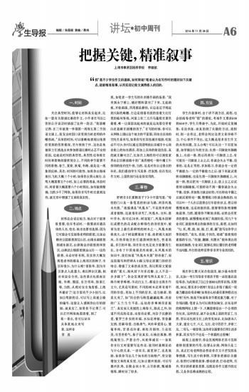 “假”是不少学生作文的通病,如何突破?笔者认为在写作时把握好如下关键点,就能精准叙事,从而实现记叙文真情感人的目的。 一、时间 关注典型时间,能够让材料真实起来。比如一篇有关朗诵比赛的作文,小作者在写自己害怕公开说话时插叙了这样一段话:“我清晰记得,在三年级第一学期第一周周五第二节的语文课上,我发言时因口误受到当时老师的冷嘲热讽。”具体的时间,可以清晰地表现出他曾经受到的伤害极深,至今耿耿于怀,这也是他被班主任挑选出来参加朗诵比赛时忐忑不安的原因。这就是时间的典型性。典型性还体现在时间和景物的紧密契合上,不同的季节需要不同的景物,春兰、夏荷、秋菊、冬梅,就是这一现象的反映。其次,时间的可能性。如果你去海南旅行,飞机大概三个小时;如果你去黄山旅行,自驾大概需要五个小时。加上必要的准备、休息时间,两者都大概需要六个小时到达。如何做到精确,当然少不了网络。如果你在写作时注意到这些,就无形中增强了文章的真实性。 二、地点 材料总会设定地方,地点对于叙事很重要。但在考试时,一般要求回避具体的人名、校名,地名也要有选择,因为它可能会引发阅卷老师的联想。比如由顾村公园联想到宝山区,由滴水湖联想到浦东新区,由碧海金沙联想到奉贤区,由枫泾古镇联想到金山区……这些联想,未必对你有利。其实你大概发现笔者举的都是上海郊区的例子,市区却很少,为什么呢?很简单,因为市区景点人流量大,难以辨识区籍,相对来说安全些。这些景点包括南京路、外滩、豫园、东方明珠、徐家汇等。当然,从绝对安全角度看,上海外最好了!这方面有不少小技巧,比如自驾游的话,可以写上高速公路的编号,这能让人感到你出行的游踪,就真实了。如果你不记得了,可以打开网络地图查看。到了某一景点,你可以站在具体某地点来写景,这样非常直观。如笔者一学生写的在西塘作画的场景:“我来到永宁桥上,铺好塑料袋坐了下来,支起画板,开始画画。四周都是静的,右边是近乎绵延到天际的廊棚,左边是错落有致的挂着大红灯笼的临河客栈,河面上有三五只乌篷船在那里歇着,唯一让画面动起来的就是远处那位穿着白衣蓝裤在摇橹的男子。”在写的时候,你可以从网络上调出这个地方的平面图,再结合具体的空间关系来写。如果你写在其他城市旅游,吃饭必不可少,你可以通过美团网找出该城市中心商业街上的知名酒店,再加上具体的街道信息,真的就无懈可击了。比如在上海的你可以到张家界永定区解放路中商广场四楼吃一顿牛魔王牛排馆的纽约克牛排。当然,这是对你去过景点的补充。我们提倡学生写真事,抒真情,但在优化作文时,上面的技巧还是很实用的。 三、事物 舒婷在《在那颗星子下》中开篇写道:“母校的门口是一条笔直的柏油马路,两旁凤凰木夹荫。”她强调是“凤凰木”,不是简单的树或者植物,这就很有讲究了。凤凰木,豆科,落叶乔木,高可达20米,树冠宽广。凤凰木因鲜红或橙色的花朵配合鲜绿色的羽状复叶,被誉为世上最色彩鲜艳的树木之一。凤凰木植株高大,由于树冠横展而下垂,浓密阔大而招风,在热带地区担任遮荫树的角色。性喜高温、多日的环境,须在阳光充足处方能繁茂生长。分布于中国南部及西南部。从凤凰木的知识中,我们知道“凤凰木夹荫”的诗意了,而这段描写和舒婷从小跟父母定居厦门的经历吻合,增强了文章的真实性。再比照原文紧接着的“夏天,海风捋下许多花瓣,让人不忍一步步踩下”,你会发现舒婷写得太真实了。上海市树香樟树,市花白玉兰,都适合出现在作文中。尤其是写景时,不同的树木花草有着不同的价值,再加上不同的层次,适当修辞,简直太美了。如“阳台的马蹄莲翩翩起舞,房前的广玉兰生生不息,远处的香樟树昂首挺立”,真实而又美丽的上海春天。除此之外,知道不同花的花语,也很有必要。风信子沉静的爱,紫罗兰朴实的幸福,水仙花神秘,常春藤友情,苔藓母爱,白杨勇气,凤铃草爱国心,雏菊单纯,苦菜花朴素,秋牡丹期待,兰花优美,百里香勇气,茄子花真实,石楠花孤独,绣线菊努力,芦荟合作,风轮草诚实……如果你在行文时需要写这些花,能同时兼顾花语与中心的关系,一语双关,就更妙了。还是旅游,如果你写出几个知名的当地特产,肯定能增加文章的真实度。比如去德州旅游,可以写德州扒鸡、乐陵金丝小枣、古贝春酒、甄城鲁锦等,瞬时好了很多。 四、方法 学生在叙事时,由于讲不清方法、流程,也会给阅卷老师“假”的感觉。考场作文要求600到800字,学生只得凑字,为此,开始时反复铺垫,东拉西扯,而真的到了关键的方法、流程时,则一言带过。老师会判定这类文章详略不当,中心事件不突出。这大概是很多差生作文的共性问题。怎么办呢?可以关注一下百度知道。如学骑自行车的方法:先将一只脚放在脚踏板上,向前一滑,然后再将另一只脚放上去,有可能另一只脚放上去之后,你就会失去平衡,没事的,这是正常的,多加练习,你就会有一定的平衡能力;一定的平衡能力之后,接下来就试着转动脚踏板,也是先将一只脚放在脚踏板上,向前一滑,然后把另一只脚放上去,放上去之后试着转动脚踏板,可能转动不到一圈你就会失去平衡,没事,多加练习就会好的;可以转动半圈之后就试着转动一圈,慢慢练习你就会熟练的,也可以叫一个人在后面将自行车给