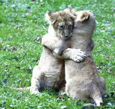 英国德文郡,两只濒危的亚洲狮幼崽Yali和Arya本来在佩恩顿动物园嬉戏打闹,突然,两只狮子幼崽仿佛怕冷一般,像人一样搂抱住对方,它俩身体直立,用前肢搂住对方身体,头挨着头,这少见的一幕被动物园的摄影师及时记录了下来。