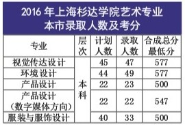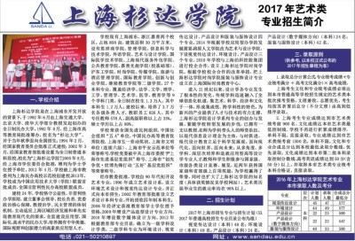 一、学校介绍 上海杉达学院是在上海浦东开发开放的背景下,于1992年6月由上海交通大学、北京大学、清华大学部分教授发起创办的全日制民办大学。1992年8月,经上海市高等教育局批准筹办,校名为“杉达大学”,并于当年秋季面向全国招生;1994年2月,经国家教育委员会批准正式建校;2002年3月,经国家教育部批准设置为全日制普通本科院校,校名为“上海杉达学院;”2005年8月,经上海市学位委员会批准,增列为学士学位授予单位。2012年4月,学校被上海市教委列为上海民办高校示范校创建校。2013年,学校成为中国应用技术大学(学院)联盟首批成员、全国非营利性民办高校联盟成员。 建校24年,学校恪守公益性、非营利性办学原则,建立董事会领导、校长负责、党委政治核心保障、教授治学、民主管理的体制机制,主动适应上海区域经济发展和率先实现教育现代化的要求,全面建设应用型、国际化、高水平的民办大学,培养拥有中华美德、国际视野和创新潜力的高素质应用型人才。 学校现有上海浦东、浙江嘉善两个校区,占地808亩,建筑面积30万平方米。设有胜祥商学院、管理学院、信息科学与技术学院、外语学院、艺术与设计学院、国际医学技术学院、上海现代服务外包学院、公共教育学院、嘉善光彪学院(校基础部)、沪东工学院、时尚学院、传媒学院、旅游与酒店管理学院、 国际教育学院、创新与创业学院、继续教育学院等二级学院,27个本科专业,覆盖经济学、法学、文学、理学、工学、管理学、艺术学、医学、教育学等9个学科门类。全日制在校生1.3万人,其中本科生1.2万人;建校以来,培养了3.7万名各级各类人才。教职员工826人,其中专任教师578人,副高级职称以上占33%,硕士学历以上占80%。 学校荣获全国先进民间组织、中国社会组织“五A”单位、中国民办高等教育优秀院校、上海市五一劳动奖状、上海市文明单位(连续六届)、上海市平安示范单位等荣誉称号。学校党委被中共上海市委授予“上海市先进基层党组织”称号、上海市“创先争优•世博先锋行动‘五好’基层党组织”等荣誉称号。 经市教委批准,学校自90年代初开设艺术专业,1996年成立艺术设计系,设立环境艺术设计和视觉传达设计专业,并正式向本市招生;2002年教育部批准设立艺术设计本科专业,开始招收四年制本科生;2006年经评定获准教育部学士学位授予资格。2009年增设产品造型设计专业方向,2010年增设数字媒体设计方向。2012年根据教育部专业目录,确立为一级学科设计学类,二级学科专业为环境设计、视觉传达设计、产品设计和服装与服饰设计四个专业。2014年根据学校应用型办学的发展需要,将原人文学院改为艺术与设计学院,下设视觉传达设计、环境设计、产品设计三个专业。2010年学校与上海纺织控股集团进行校企合作,设立上海杉达学院时尚学院。根据学校校企合作的改革举措,把上海杉达学院时尚学院服装与服饰设计专业设立在上海国际时尚教育中心。 进入21世纪以来,设计学各专业发生了根本性的变化,传统学科迅速融入了全球信息化轨道,集艺术、科学、经济和文化于一体,形成集成性、跨学科性的特色,为新兴的产业提供了人才与技术的有力支撑。上海杉达学院设计学系列专业的创办与发展,紧随学校转型发展的步伐,已拥有一支以教授、名师为学科带头人的师资队伍,以现代信息设计理念为主体,与时俱进。现代设计教育立足于科学发展观,面向现代化、面向世界、面向未来;从多角度、多学科、深层次培养和造就应用型高等设计学专业人才。教师和学生积极参与国家级、市级各类设计竞赛、展览,近两年获得国家级和省部级上百项奖励,为学校赢得了荣誉,同时也扩大了上海杉达学院的知名度(具体获奖情况见学校网站)。艺术类历届毕业生的就业率均在98%以上。 二、招生计划 2017年上海市招生专业与招生计划(以2017年普通高校招生专业目录公布为准) 视觉传达设计(本科)48名;环境设计(本科)48名;产品设计(本科)24名; 产品设计(数字媒体方向) (本科)24名;服装与服饰设计(本科)42名。 三、录取原则(供参考,以本校正式公布的2017年招生章程为准) 1.录取总分计算公式:专业统考成绩+(专业统考满分÷高考文化满分)×高考成绩。 上海考生文化和专业统考成绩必须达到本市普通高等学校招生规定的艺术类本批次报考资格,文理兼收,志愿优先,考生均按其折算后总分(不分文理)由高到低排序录取。 2.上海考生专业成绩达到市艺术类统考前900名、文化成绩达本市艺术类最低控制线、学校不再进行折算成绩排序,单科不限,直接录取;专业成绩达到市艺术类统考前1500名,单科不限,文化和专业合成总分达到本校最低录取分数线,优先录取;文化成绩达到本市第二批本科录取控制分数线、高考英语成绩达到50分(含50分)以上,并取得本市艺术类专业统考本科合格证,直接录取。 电话:021-50210897 网址: www.sandau.edu.cn