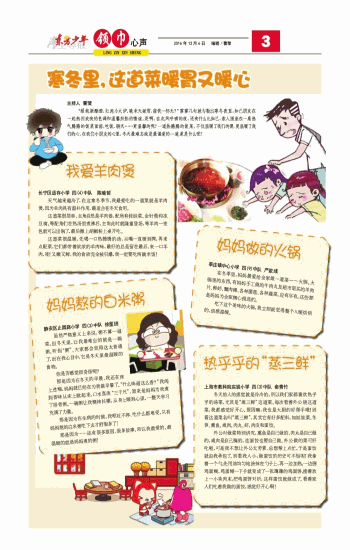 主持人 曹莹 “绿蚁新醅酒,红泥小火炉。晚来天欲雪,能饮一杯无?”寥寥几句就勾勒出寒冬夜里,知己朋友在一起热烈欢快的色调和温馨炽热的情谊。是啊,在北风呼啸的夜,还有什么比知己、亲人围坐在一桌热气腾腾的饭菜面前,吃饭、聊天……更温馨的呢?一道热腾腾的饭菜,不仅温暖了我们的胃,更温暖了我们的心。在我们小朋友的心里,冬天最难忘或是最偏爱的一道菜是什么呢? 我爱羊肉煲 长宁区适存小学 四(4)中队 陈瑜哲 天气越来越冷了,在这寒冬季节,我最爱吃的一道菜就是羊肉煲,因为羊肉具有温补作用,最适合在冬天食用。 这道菜很简单,主角自然是羊肉卷,配角有娃娃菜、金针菇和冻豆腐。等配角们在热汤里煮沸后,主角此时就隆重登场,等羊肉一变色就可以出锅了,最后撒上胡椒粉上桌开吃。 这道菜很温暖,先喝一口热腾腾的汤,从嘴一直暖到胃,再来点配菜,它们都带着浓浓的羊肉味,最好的总是留在最后,来一口羊肉,哇!又嫩又鲜,我的食欲完全被引爆,我一定要吃两碗米饭! 妈妈熬的白米粥 静安区止园路小学 四(3)中队 徐星玥 虽然严格意义上来说,粥不算一道菜,但冬天里,让我最难忘的就是一碗粥。听到“粥”,大家都会觉得这太普通了,而在我心目中,它是冬天里最温暖的食物。你是否感觉很奇怪呢?那是因为在冬天的早晨,我还在床上迷糊,妈妈就已经在为我做早餐了。“什么味道这么香?”我闻到香味从床上跳起来,口水直流“三千尺”,原来是妈妈为我煮了排骨粥。一碗粥让我精神抖擞,从身上暖到心里,一整天学习充满了力量。那是因为在生病的时候,我呕吐不停,吃什么都难受,只有妈妈熬的白米粥吃下去才舒服多了!那是因为……还有很多原因,很多故事,所以我最爱的、最温暖的就是妈妈煮的粥! 妈妈做的火锅 莘庄镇中心小学 四(9)中队 严歆彧 在冬季里,妈妈最爱给全家做一道菜——火锅。火锅里的东西,有妈妈手工做的牛肉丸及超市里买的羊肉片、鲜虾、蟹肉棒、各种菌菇、各种蔬菜,应有尽有。这些都是妈妈为全家精心挑选的。吃下这个美味的火锅,我立刻就觉得整个人暖烘烘的,倍感温暖。 热乎乎的“蒸三鲜” 上海市教科院实验小学 四(3)中队 俞青竹 冬天给人的感觉就是冷冷的,所以我们家都喜欢热乎乎的汤菜,尤其是“蒸三鲜”这道菜。每次看着外公烧这道菜,我都感觉好开心。原因嘛:我也是大厨的好帮手哦!别看这道菜名叫“蒸三鲜”,其实它有好多配料,如娃娃菜、冬笋、熏鱼、咸肉、肉丸、虾、肉皮和蛋饺。 外公对做菜特别讲究,熏鱼是自己做的,肉丸是自己做的,咸肉是自己腌的,连蛋饺也要自己做。外公做的菜可好吃啦,可是我不想让外公太劳累,总想帮上点忙,于是蛋饺就由我承包了。别看我人小,做蛋饺的历史可不短呢!我拿着一个勺,先用油均匀地涂抹在勺子上,再一边加热,一边倒鸡蛋糊,鸡蛋糊一下子就变成了一张薄薄的鸡蛋饼,接着放上一小块肉末,把鸡蛋饼对折,这样蛋饺就做成了。看着家人们吃着我做的蛋饺,感觉好开心啊!