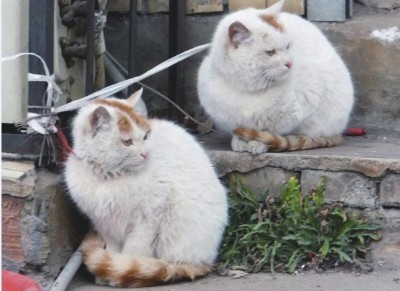 放学路上,看见两只猫,真像是双胞胎啊,不仅长得像,卧姿也相同,连扭头看街景的眼光都惊人的一致。