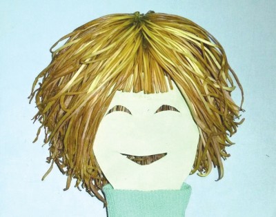 家里的菊花凋谢了,我用枯萎的花瓣,放一个剪好的笑脸图案,再加上一段从洗澡巾上剪下的布,一个酷酷的“美女”诞生了,像不像妈妈?