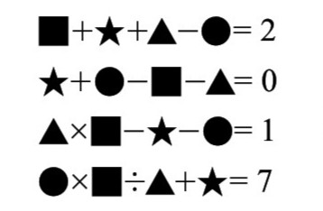 上面的图形分别换成1、2、3、4四个数字中的哪一个,才能使四个等式都成立?