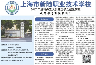 学校概况 上海市新陆职业技术学校是市百所重点职校,地处金桥出口加工区,与中国(上海)自由贸易试验区、张江高科技园区相毗邻,交通便捷,具有得天独厚的学习、实习、就业的条件和环境。 学校坚持“以人为本,德技双修,人人成才,服务社会”的办学理念和“立足新区,面向上海,服务社会,争创一流”的办学定位,为全市企事业单位输送了大量的优秀毕业生,受到用人单位的高度好评。学校还为学有余力的同学搭建平台,创造各种提高学历的途径,满足学生终身发展的需求。 特色专业 1.学前教育(上海市紧缺专业,享受市专业奖励) 上海市精品特色专业,面向全市招生,只招女生,可住宿,学制3年。要求身体健康,五官端正。学前教育专业是全市同类学校中创办时间较早、教育资源丰富、育人质量显著的专业。主要培养学前教育行业所需的保育员、保健员、育婴师、营养师等专业人才。在全市拥有300多个幼儿园、托儿所和早教中心实习基地,优秀毕业生可升入高一层次的大专院校深造。 2.汽车运用与维修 校重点建设专业,男女兼收,可住宿,学制3年。要求身体健康,无缺陷。上汽集团公司、永达汽车集团公司、通用公司、大众公司、通汇公司等对我校的学生给予高度评价和肯定。我校的永达冠名班定向为集团输送高素质专业人员。该专业的毕业生就业通畅。 3.社区公共事务管理 校特色专业,男女兼收,可住宿,学制3年。要求身体健康,无缺陷。学校针对上海国际化大都市的发展需求,专业培养面向国际社区、市政街道、文化会所等方面的专业人才,注重人文素养和专业技能的培养,受到行业的好评。 4.电子技术应用(上海市紧缺专业,享受市专业奖励) 区骨干专业,男女兼收,可住宿,学制3年。要求身体健康,无缺陷。学校采用订单式培养模式,长期为日立、贝尔、西门子、欧姆龙、理光、三井等几十家中外企业输送技能型专业人才,市场需求旺盛,就业形势喜人。 5.文秘 6.计算机 校特色专业,男女兼收,可住宿,学制3年。要求身体健康,无缺陷。注重学生行为规范与专业技能的培养,通过在校学习和岗位实训,每位学生都拥有文字录入初级证书和办公软件中级证书。历届毕业生在各大公司从事文员、技术维修人员等重要工作,毕业生供不应求。 招生热线:50695730(可传真) 50694952 50694950 交通路线:81、640、971、610、405、浦东15路、浦东35路等浦东大道沿线车辆均到东葛 路东靖路车站下。 学校地址与网址:浦东北路1010号(610终点站旁) http://www.xlzx.pudong-edu.sh.cn