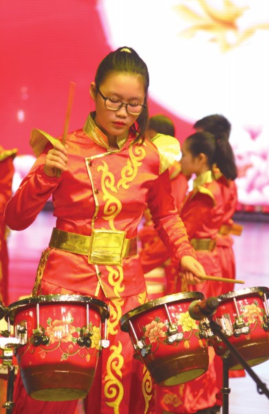 带着对中国鼓的挚爱,我进入了黄浦区青少年活动中心市级民乐学生艺术团,成长为打击乐声部的一名演奏员。当我拿着新的谱子和乐队100多号人一起演奏时,内心颇感自豪。在去年黄浦区举办的教师节庆祝活动上,我们演奏了《赛马》和《茉莉花》,《赛马》刻画蒙古族人民节日赛马的热烈场面,它把草原的辽阔美丽和牧民们的喜悦心情表现得酣畅淋漓。