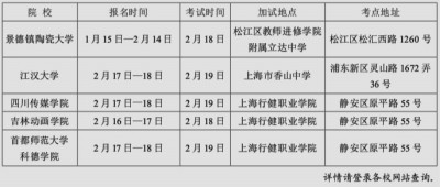 本报讯 根据上海市教育考试院《关于印发〈2017年上海市普通高等学校艺术类专业招生实施办法〉的通知》(沪教考院高招〔2016〕43号)文件的要求,现将2017年经批准在沪设点组织艺术类专业加试的外省市本科院校名单及报名考试时间汇总如上表: