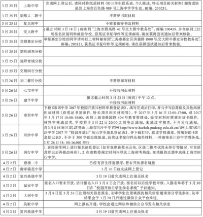 上海普通高中提前招生录取自主选拔工作由此拉开序幕。据记者了解到,3月25日、3月26日、4月2日,上海部分提前招生录取高中学校也将陆续开展校园开放日活动。截至目前,共有21所市重点高中发布了2017年自主招生信息,小编为了省去大家东找西找的麻烦,把信息简明扼要地做成了表格,看看你心仪的学校是否会撞车?赶紧做出最好的选择吧。 >>>小提示: 何为“开放日” 开放日即上海市高中学校举行的和本校新一届高一新生招生相关的一种活动,这种活动一般需要提前报名,报名时间一般持续半个月,学校官网会发布相关通知,考生要按照学校官网公布的活动要求提交一系列材料,一般来说只有在考生提交的材料通过学校审核之后,考生才能参加该校的开放日活动。校园开放日活动包括学校介绍、校园参观、课程体验等。 在5月中旬“提前招生录取志愿填报”之前,所有的自招考试都只是学校单方面的行为,考生可以结合自身实力和目标选择N所学校参加他的自招考试,只要你有这个时间、有这个精力,所以自招考试是没有学校数量限制的,但是,在5月中旬网上填报“提前招生录取志愿”的时候,不论考生参加了多少所学校的自招考,拿到了多少份录取承诺书,都只能选择其中的两所填报。