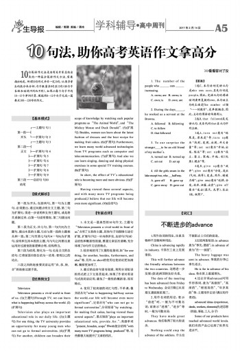 1.本文是一篇典型的10句作文,主题句“Television presents a vivid world in front of us.”点明了文章的主题,其他句子均围绕它进行扩展。扩展句(句2—9)内容详实,总结句(句10)总结性和概括性很强。整篇文章层次清晰,充分体现了10句作文法的特点。