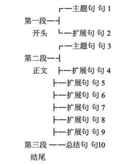 第二段为正文,共七句。第一句(句3)为主题句,提出本段的主题,它应与第一段的主题相关和一致;第二句至第七句(句4一句9)为扩展句,说明和支持本段的主题。句与句之间要注意运用好过渡使段落逻辑合理,结构得当。