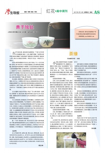 小时候,看到爷爷泡茶,只见那普普通通的杯子里,清澈的水上漂着大片绿叶。我问:“这水能喝吗?”爷爷笑着说:“能。”“那这叶子也能吃吗?”爷爷摇了摇头,说:“不能。”我心下虽疑惑,但那水仿佛有种魔力吸引着我。我嚷嚷着想尝一口,可爷爷说我还小,再大点就能喝了。 这是我对茶的第一印象。 后来,父亲心血来潮买了茶具。我对那个茶盘印象深刻,因为它好看。用热滚滚的开水浇灌这副茶具,我似乎闻到了淡淡的清香。再将铁观音倒入紫砂壶后,倒入开水,只见一粒粒小球似的茶叶漂浮起来,随着倒入的水柱打滚。倒好水,盖上盖子。约摸过了半晌,我左手扶盖,右手执把,将壶里的水全部倒出,像浇花一样浇着面前的茶具。为什么要倒掉?我不知,因这是父亲告诉我的。第二次再泡时,茶叶已舒展开,填充了整个紫砂壶。我迫不及待尝了一口。入口时,微苦,舌根有点涩。但咽下时,只觉喉间一股清凉,整个人有神清气爽之感。这或许就是茶吧! 这是我对茶的味道的第一印象。 从此,茶好像融入了我的生活中,学习之余,泡一壶茶,已成为我提神的工具。冥冥之中,它成了我生命中不可缺失的一角。 之后的日子里,我常常好奇:这世间为何会有这样的一种东西,让我一想到它,便心情舒畅?为何当它一入口,就觉得烦躁离我远去,换来一片宁静?为何当它被泡得淡到无味之时,我依旧恋杯,不愿停下? 或许是因为它的高贵:茶的最早发现与利用是从药用开始的,其清热解毒的功效给人高尚之感,正是这样神圣的起源奠定了它高贵的气质。 或许是因为它的历史悠久:从西晋至隋朝的时候茶便成为很多人家“一日不可无”的饮品。 抑或是因为它的与众不同:相较于咖啡的刺激浓郁,茶是需要“品”,才能感受得到它独有的蕴藉淡雅;还有就是茶文化中所蕴含的哲理与儒家的中庸和谐之道十分相似,讲究在品茶时感受和谐的意境。 而它真正让我领悟到的是:品茶可使人心静,并修身修德。当代茶圣吴觉农先生曾言“君子爱茶,因为茶性无邪”,真正懂茶并爱茶的人,必然从品茶的过程中感受到精神调节和自我修养的提升,这是一种灵魂净化的过程。 或许正是这多方面的原因,茶文化才能成为中国传统文化相当重要的一环,而它也早已渗入我心。同时也希望这份茶缘可以伴随我成长,让我在漫漫人生路中领悟更多的哲理…… 【点评】 作者从“我”对“茶”的好奇,到对“茶的味道”的印象深刻,到自己的生活中离不开“茶”,进而使自己渴望去了解“茶文化”,思路非常清晰,紧紧扣住了“茶缘”二字!写得很真实,很朴实。 (刘戈缨)
