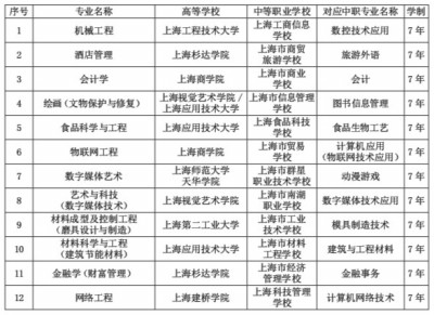 2017年,上海市将在有关学校新增12个专业开展中等职业教育—应用本科专业贯通培养模式试点工作,涉及上海工程技术大学、上海工商信息学校、上海视觉艺术学院、上海市南湖职业学校、上海第二工业大学、上海市工业技术学校等院校。