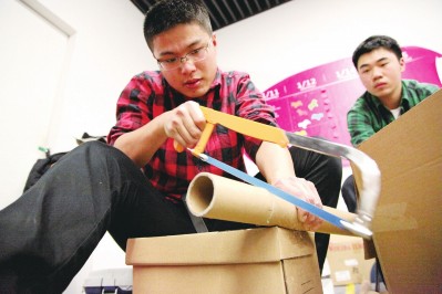 作品说明:拍摄内容为两个男同学在创意制作课上像大力士一样,锯着厚纸板,那神情,想想就知道纸板得有多厚!辛苦你们啦!