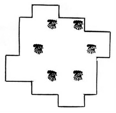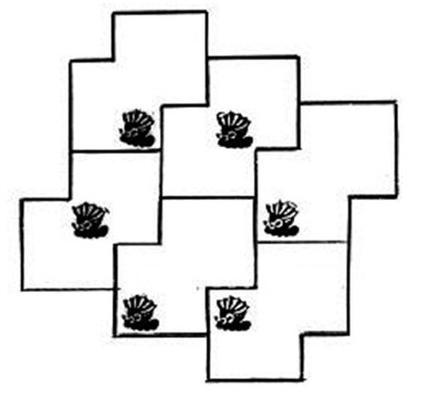 把场地分成形状、大小完全相同的六块, 要求每块里面都有鸡,应该怎样分?