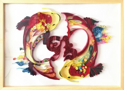 作品说明:衍纸就是将纸条通过卷曲、弯曲,捏压而形成原始设计形象的一门折纸艺术。该作品是藏族同学当增行毛创作,通过对中国传统元素中双鱼的形象再创作,表达了吉祥如意的祝愿。