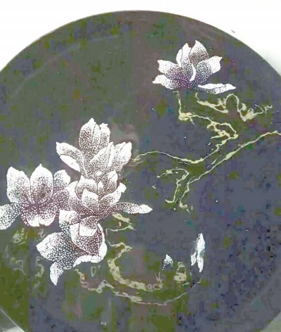 本作品运用漆艺中的蛋壳镶嵌工艺,在蛋壳干后雕除不整齐的部分,刷上黑漆,刷细炭粉,打磨,全面髹漆、再打磨,使其显出蛋壳花纹来。作品以黑为主色,表现当它们“受伤”时无人问津的凄凉;白色是用蛋壳在漆盘上拼贴而成的,体现了花虽“残”,但风韵犹存,表现了一种不一样的美;树枝周围的墨绿色,表现了它们的生机与不愿就此落败的固执。