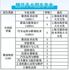 ●国家中等职业教育改革发展示范学校 ●国家重点中等职业技术学校 ●全国职业教育先进单位 ●上海市文明单位 ●上海市中小学行为规范示范校 招生对象和条件 1.考生父母一方持有效期内《上海市居住证》;或者考生父母一方持有《就业失业登记证》的灵活就业人员,从首次登记日起至2017年5月12日须连续3年在街道社区事务受理中心办妥灵活就业登记,且持有《上海市临时居住证》,从首次发证日起至2017年5月12日有效期满3年。 2.考生在本市全日制初中学校连续就读3年的应届初三学生。 3.考生本人持有公安部门颁发的有效身份证或户口簿原件及《上海市临时居住证》。 注:凡同时符合以上报名条件的考生,可参加本市全日制普通中等职业学校自主招收进城务工人员随迁子女招生报名(包括“中高职贯通培养模式”招生)。随迁子女往届初中毕业生不能参加报名。 助学政策 1.被我校录取的中职、进城务工人员随迁子女的学生,就读奖励专业(学前教育、数控、服装)学生可享受免费教育(一学期免学费2000元,书本费200元)享受三年。享受助学金一学期1000元,三年制享受2年。 2.被我校录取的中职、进城务工人员随迁子女的学生,就读园林专业享受免费教育(一学期免学费2000元,书本费200元)享受三年。享受助学金一学期1000元,三年制享受2年。 3.被我校录取的中职、进城务工人员随迁子女的学生,就读汽修、计算机、民乐学生,根据父母及本人有一方是否农村、海岛、低保、低收入、本人残疾等相关材料及证明,可享受免费教育(一学期免学费2000元,书本费200元)享受三年。助学金一学期1000元,三年制享受2年。 联系人:(姚老师18918953102 冯老师18918953107) 招生热线:021-33584904 微信公众号:qunyizhixiao 地址:上海市闵行区元江路4080号 官网:http://qyzx.mhedu.sh.cn 交通路线:徐闵线、地铁5号线、莘南线、莘海专线、莘团线、虹桥5路、上石线、莘枫专线、南嘉线、莲石线、庄梅专线、莘金线、芦杜线等,至颛桥站转闵行17路(花王路站下),至北桥转闵行5路到学校,闵行21路(元江路下),闵行9路直达学校。