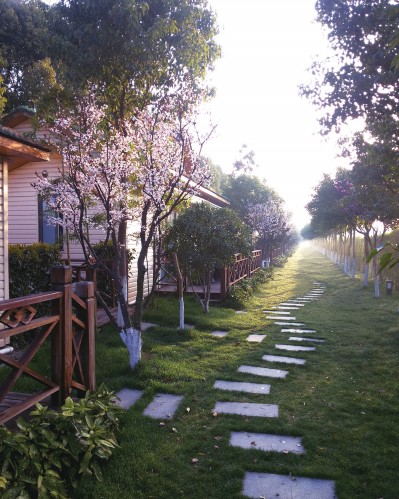 说明:清晨的一缕阳光,透过薄薄的晨雾,照射在绿树掩映的农家小屋上,洁白的珍珠梅透露出初春的勃勃生机,一条幽静的青石板路延伸至远方……一切都充满着盎然生机。