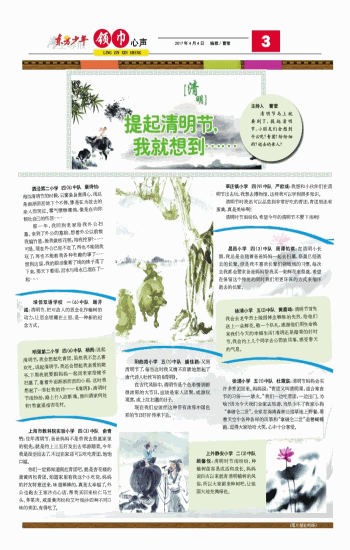 清明节马上就要到了,提起清明节,小朋友们会想到什么呢?青团?纷纷细雨?逝去的亲人? 泗泾第二小学 四(5)中队 章诗怡: 每当清明节的时候,云雾袅袅意清心,雨总是淅淅沥沥地下个不停,像是在为故去的亲人而哭泣。雾气缥缈缠绵,像是在向你倾吐自己的伤悲…… 那一年,我回到老家给我外公扫墓。来到了外公的墓前,想着外公以前教我编竹篮;教我做桂花糕;陪我挖萝卜……可是,现在外公已经不在了,再也不能陪我玩了;再也不能教我各种有趣的事了……想到这里,我的眼泪像断了线的珠子落了下来,那天下着雨,泪水与雨水已混在了一起…… 培佳双语学校 一(6)中队 顾开诚: 清明节,把对故人的思念化作植树的动力,让思念埋藏在土里,是一种新的纪念方式。 明强第二小学 四(6)中队 杨雨: 说起清明节,我会想起吃青团,虽然我不怎么喜欢吃。说起清明节,我还会想起我亲爱的姥爷,下周我就要跟妈妈一起回老家给姥爷扫墓了。看着外面淅淅沥沥的小雨,这时我想起了一首杜牧的诗——《清明》:清明时节雨纷纷,路上行人欲断魂。借问酒家何处有?牧童遥指杏花村。 上海市教科院实验小学 四(3)中队 俞青竹: 往年清明节,爸爸妈妈不是带我去祭奠家里的祖先,就是约上三五好友出去郊游踏青。今年我是没空出去了,不过在家还可以吃吃青团,饱饱口福。 你们一定都知道网红青团吧,就是杏花楼的蛋黄肉松青团。知道家里有我这个小吃货,妈妈的好友特意送来,味道棒棒的,真是太幸福了。外公也跑去王家沙点心店,帮我买回来松仁马兰头、荠菜肉、咸蛋黄肉松和艾叶细沙四种不同口味的青团,有得吃了。 阳曲路小学 五(1)中队 盛佳颖: 又到清明节了,每当这时我又情不自禁地想起了唐代诗人杜牧写的《清明》。 在古代风俗中,清明节是个色彩情调都很浓郁的大节日,应该是家人团聚,或游玩观赏,或上坟扫墓的日子。 现在我们应该把这种带有浓郁中国色彩的节日好好传承下去。 莘庄镇小学 四(9)中队 严歆彧: 我想和小伙伴们在清明节出去玩,我想去博物馆,这样我可以学到很多知识。 清明节时我还可以品尝到非常好吃的青团,青团里还有蛋黄,真是美味啊! 清明时节雨纷纷,希望今年的清明节不要下雨哟! 昌邑小学 四(3)中队 周谭佑祺: 在清明小长假,我总是会随着爸爸妈妈一起去扫墓,祭奠已经逝去的长辈。但是我不喜欢长辈们烧纸钱的习惯,每次去我都会要求爸爸妈妈帮我买一束鲜花来祭奠,希望在保留这个传统的同时我们用更环保的方式来缅怀逝去的长辈。 徐浦小学 五(3)中队 黄嘉琦: 清明节首先我会去龙华烈士陵园悼念牺牲的先烈,给他们送上一朵鲜花,敬一个队礼,感谢他们用生命换来我们今天的幸福生活!清明还是踏青的好时节,我会约上几个同学去公园放风筝,感受春天的气息。 徐浦小学 五(1)中队 杜秉宸: 清明节妈妈会买许多青团回来。妈妈说:“青团又叫清明果,适合寒食节的习俗——禁火。”我们一边吃青团,一边出门。为啥?因为今天我们全家去郊游,当然少不了我家小狗“拿破仑二世”。全家在海湾森林公园草地上野餐,看着天空中各种各样的风筝和“拿破仑二世”追着蝴蝶跑,逗得大家哈哈大笑,心中十分享受。 上外静安小学 二(3)中队 顾馨悦: 清明时节雨纷纷,种植树苗容易成活和成长。妈妈说自古以来就有清明植树的风俗,所以大家都来种树吧,让祖国大地充满绿色。