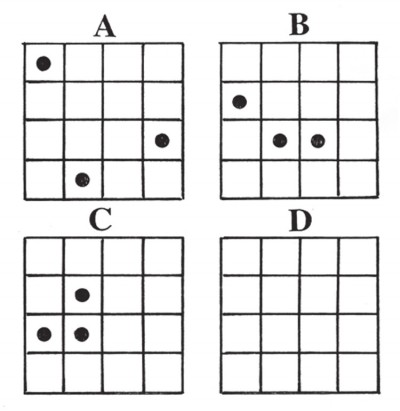 请找出黑球的移动规律,想一想,三个黑球在D图中应该处在什么位置上?