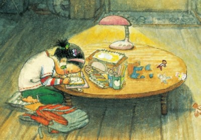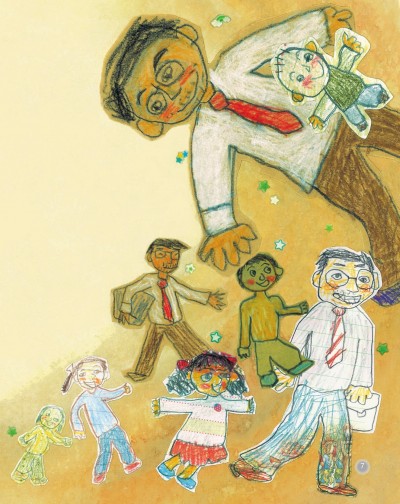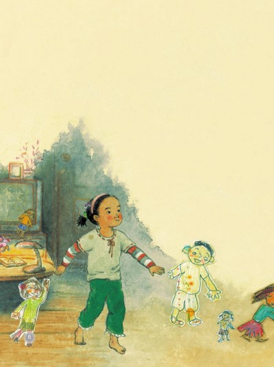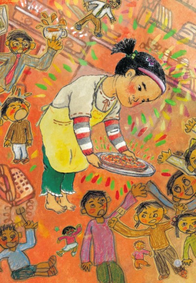 乐乐的梦 1 乐乐和妈妈两个人一起生活。她有一个梦想,那就是长到像妈妈一样漂亮的大人的时候,娶10个老公,生100个孩子。 乐乐的妈妈在超市工作,平常要到晚上7点才下班。从学校放学到妈妈回家的这段时间,乐乐都要一个人在空空的房子里打发时间。 如果赶上超市客人多的话,妈妈就要工作到晚上9点。每当这个时候,乐乐便一一给100个孩子取名字,今天也是这样。 现在,秘密日记本上已经写到了第49个名字。 “取什么名字呢?得好好想想……” 2 乐乐写了好几遍第50个名字,但都不满意,又擦了去。 乐乐冥思苦想,肚子饿得咕噜噜直叫唤,但她始终一动不动地坐在桌子旁,低头认真地想着名字。 突然好像有人在说话,乐乐猛地抬起头来。令她吃惊的是,许多自己没见过的孩子围绕在自己身边。孩子们都朝着乐乐伸出胳膊,叫着:“妈妈!妈妈!” 数一数,总共是100个孩子。其中49个有名字,剩下的51个没有名字。紧接着,孩子们中间出现了年轻又帅气的丈夫们。丈夫们挥着手,冲着乐乐喊着:“老婆,老婆!” 这就是乐乐梦想的画面:10个老公,100个孩子。 乐乐高兴得眼泪都要流出来了。 3 “是啊,家人这么多真好,整天热热闹闹、开开心心的。” 乐乐虽然十分忙碌,但是却非常快乐: “没错,这才像一个幸福的家庭,这样热热闹闹的,就没有时间觉得孤独啦,太好了!” 渐渐地,乐乐累了。她忙不迭地跑来跑去,哪怕是有10个胳膊、100条腿也不够用啊!再看看老公们和孩子们,他们却更加来劲了。乐乐走到这边,他们就都一窝蜂地追到这边;乐乐走到那边,他们又都一窝蜂地赶到那边…… 好不容易到了晚上,老公们和孩子们都睡了,乐乐也蜷缩在屋子的角落里,渐渐地打起盹来。 “别管我!别管我!让我休息会儿!” 乐乐喃喃地说着梦话,妈妈轻轻地摇醒她。原来妈妈下班回家了。