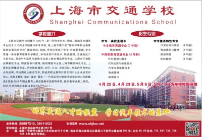学校简介 上海市交通学校创建于1960年,是一所培养汽车、物流、船舶等交通类专业技术人才的全日制重点中专学校,是上海市第三批“国家中等职业教育改革发展示范学校”建设单位。目前,学校已形成了中专、中高职贯通、中本贯通一体化教育培养办学模式。学校设有汽车技术、物流管理、交通航运三大类专业,其中汽车运用与维修专业是上海市精品特色专业、上海市示范性品牌建设专业,物流服务与管理、船舶驾驶专业是上海市精品特色专业、上海市品牌建设专业;学校现有通用、丰田、大众、交运日红、交运内河等校企合作品牌。学校拥有上海市汽车、物流类职业教育开放实训中心及水运实训中心,学校《教学 培训 鉴定 服务--汽车运用与维修开放实训中心创新建设》荣获2014年职业教育上海市级教学成果特等奖、国家教学成果二等奖。2016年学校毕业生就业率为98.75%以上。 招生专业 中专—高校直通车 中本教育贯通专业(7年制) 物流管理 中高职教育贯通专业(5年制) 汽车营销与服务 汽车运用与维修技术 汽车车身维修技术 物流管理 航海技术 中专重点特色专业 汽车运用与维修 (4年制) 物流服务与管理 (3年制) 船舶驾驶 (4年制) 轮机管理 (4年制) 4月22日、4月23日、5月6日、5月13日为学校校园开放 咨询热线:56997213、36111023 欢迎登录 www.shjtxx.net 学校地址:上海市宝山区呼兰路883号 交通:地铁1号线呼兰路站下车向东步行5分钟;驾车沿南北高架共江路匝口下至呼兰路右转500米;公交46、95区间、172、527、722、726、728、845路均可到达。