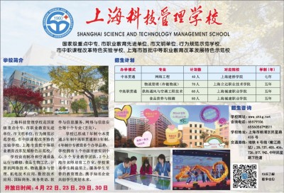 学校简介 上海科技管理学校是国家级重点中专、市职业教育先进单位、市文明单位、行为规范示范学校、市中职课程改革特色实验学校、上海市首批中等职业教育改革发展特色示范校。 学校设有制冷和空调设备运行与维修、食品生物工艺、计算机网络技术、物流服务与管理、机电技术应用、数控技术应用、国际商务、商务英语、软件与信息服务、网络与信息安全等十个专业(方向)。 学校已形成7年制中本贯通、5年制中高职贯通和3年制、4年制中专教育多个办学品种。学校拥有3个市级开放实训中心,9个专业教学团队,2个上海市名师培育工作室。学校秉承学生利益至上、服务学生至善的教育理念,携手知名企业共创学生美好未来。 开放日时间:4月22日、23日、29日、30日 招生咨询 学校网址:www.shkg.net 咨询电话:65579106 65560567*8511 学校地址:上海市杨浦区民星路435号 交通路线:地铁8号线(嫩江路站)、28、137、405、406、726、817、942、中环民星路下匝道