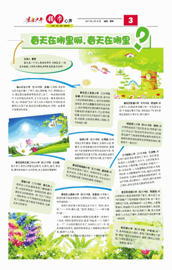 主持人 曹莹 春天是一个令人期待的季节,万物复苏,一派生机勃勃。小朋友们都是在哪里发现春天的呢? 福山正达小学 五(4)中队 贠赫: 几周前,我在阳台的花盆中撒下了种子,细心照料着。今天,黑黑的泥土中,冒出碧玉般翠绿翠绿的芽儿来了。一株浓绿的两瓣叶子呈标准的放射形,长大后必定是一棵美丽的幸运草。边上的是刚“出生”没几天的小鸡冠花,昨夜的狂风暴雨让它焉了神,但还是坚强地爬起来,同我一起看春天那曼妙的身姿。 静安区闸北第二中心小学 四(2)中队 王沁馨: 春天来了,我在公园看见迎春花、杜鹃花、桃花、郁金香、樱花竞相盛开、百花争艳,多么美丽的景象啊! 爱菊小学 二(1)中队 秦之洲: 上周我在小区池塘里看到了癞蛤蟆产卵,水底的卵连成一条黑色的线,像外婆结毛衣的粗绒线一样,可长了!经过一周的等待,今天我真的在池塘里看到了小蝌蚪!春天真是万物复苏,充满生命力的季节! 静安区三泉路小学 二(1)中队 张曦: 春天在暖暖的阳光里,春天在小河边翠绿的柳枝上,春天在绵绵的细雨里,春天在蠢蠢欲动的毛毛虫身上,还在那暖风吹落的樱花和桃花的花瓣雨里!我喜欢春天,可以穿得很轻薄,在这不冷又不热的天气里打篮球、玩轮滑、忘我地在操场上疯跑,这个feel倍儿爽! 徐浦小学 五(1)中队 杜秉宸: 妈妈带我去莘庄梅园,看梅花;去顾村公园,赏樱花,好多姹紫嫣红的花争相怒放,真漂亮!可是我最喜欢的荷花还没有开放,我知道荷花是在夏天开放,但如果在这朝气蓬勃的春天有了荷花的点缀,岂不更好? 静安区阳曲路小学 五(1)中队 盛佳颖: 我就在家里看到了春天。我家的阳台上就有一盆水仙花,它是在春天里盛开的。当水仙花开时,家里就充满了淡淡的清香,优雅极了。 静安区止园路小学 四(3)中队 徐星玥: 大多数人眼里的春天都是美丽的、五彩缤纷的,到处一片鲜花,到处芳香四溢…… 但我们班的春天画风就完全不同了:“老师,我头疼。”——37.9(摄氏)度。“老师,我想吐。”——38.5(摄氏)度…… 一到春天,班里就流行感冒!发烧!最多一次有8个人没来。用我们老师的话说,就是“站起来一个,又倒下去一个”。不过现在情况好多了,生病的人少了一半,但是病毒没有消失,跑到其他班级去了,隔壁班比我们厉害,最多9个人不来。 啊!病毒,求求你快走吧!还我们一个美好的春天! 嘉定区普通小学 五(9)中队 周金晔: 最让我开心的就是家里藏了快一年的蚕宝宝卵,不知道从哪天开始,突然钻出了好多好多黑色细细的小蚕宝宝,春天真好! 明强第二小学 四(6)中队 杨雨: 春天悄悄地来到了我们的身边!我家楼下的玉兰花长出了粉色的花骨朵;阳台上的雏菊也盛开了;地里绽放着金黄的油菜花;外婆家的麦地里的麦苗也变得绿油油的,跟着春天一起生长! 大宁国际小学 三(3)中队 孔单繁: 我在我们家的鱼缸里看见了春天。我们家鱼缸里的小乌龟醒了。在冬天,它的四肢和头缩在壳里,心跳很慢,不常游动,好像死了一样;而现在呢,小乌龟慢慢地把四肢从壳里伸出来,头也慢慢地伸了出来,随后它的四肢开始划动,边游泳边慢慢地将眼皮睁开。在这个时候,我们要给它一点吃的,最好是鱼虾之类的,因为这些是它最爱吃的东西。 复旦科技园小学 四(1)中队 陈紫陌: 我从我家的小蚕盒里感受到了春天。春天来了,去年的蚕蛾产下的卵随着气温的升高,在一夜之间孵化了出来,密密麻麻的一大片黑色。小蚕需要桑叶,想起前不久还光秃秃的桑树丫,我犯愁到哪儿去找桑叶。到小区里转了一圈,我才发现桑树丫上已长出了嫩叶,仿佛约定好来给春天增一抹色彩。 莘庄镇小学 四(9)中队 严歆彧: 有一天,我和妈妈去公园玩,看到了桃花露出了笑脸,看到了梨花正向我挥手,看到了樱花正对我说,“小朋友春天来了。”我爱你,春天!