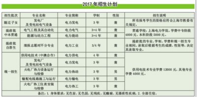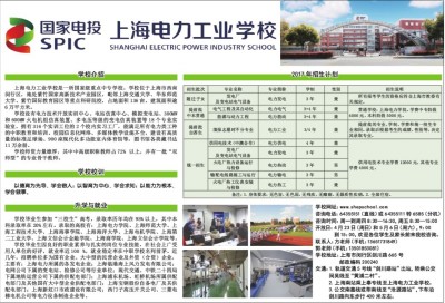 学校介绍 上海电力工业学校是一所国家级重点中专学校。学校位于上海市西南闵行区,地处紫竹国家高新技术产业园区,毗邻上海交通大学、华东师范大学、紫竹国际教育园区等重点科研院校,占地面积136亩,建筑面积逾6万平方米。 学校设有电力技术开放实训中心、电站仿真中心、模拟变电站、300MW和600MW火电机组仿真装置、多电压等级的变电仿真装置等18个专业实验室,拥有316个实训工位的2个校内实习工厂,能满足所有电力类工种的中职教育和培训。校园信息化网络、多媒体教学设施齐全,建设有高质量的标准足球场、900座现代化多功能室内体育馆等,图书馆各类藏书达11万余册。 学校师资力量雄厚,其中中高级职称教师占72% 以上,并有一批“双师型”的专业骨干教师。 学校校训 以德育为先导、学会做人;以智育为中心、学会求知;以能力为根本、学会做事。 升学与就业 学校毕业生参加“三校生”高考,录取率历年均在95%以上,其中本科录取率在20%左右。录取的高校有:上海电力学院、上海师范大学、上海工程技术大学、上海海事学院、上海海洋大学、上海电机学院、上海第二工业大学、上海立信会计金融学院、 上海商学院、 上海立信会计学院等。 学校毕业生因良好的职业素养与扎实的岗位专业技能,在社会上广受用人单位的好评,就业率近100 %,就业稳定率在中职学校名列前茅。近几年,招聘单位多为国有企业、大中型的民营企业及外资(合资)企业,主要有:上海电力所属的各发电企业;上海临港海上风力发电有限公司;电网公司下属的变电站、检修公司等行业单位;现代交通、中铁二十四局下属地铁运营公司下属的供配电部门;上海浦东机场、虹桥机场所属供配电部门及其他国有大中型企业供配电部门;上海宝钢股份自备电厂及其供配电部门;上海新虹口市政建设有限公司;西门子高压开关公司、三菱电梯电机公司等电力设备制造企业等。 学校网址:www.shepschool.com 咨询电话:64355151(直线)或64355111转6585(分机) 咨询时间:周一到周四8:30—16:30,周五8:30—15:00 开放日:4月23日(周日)和5月6日(周六),9:00到 15:00,欢迎各位学生及家长前来我校咨询。 联系人:方老师(手机:13651731849) 郭老师(手机:13501853081) 学校地址:上海市闵行区剑川路665号 邮政编码:200240 交通:1.轨道交通5号线“剑川路站”出站,转乘公交闵吴线至“黄浦二村”。 2.上海南站乘上奉专线至上海电力工业学校。 3.公交南嘉线或莘南线至“沧源路站”,下车沿剑川路向东步行400米左右。
