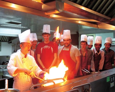说明:刀影火光间,烹饪教师展现中华烹饪的硬功夫!围观的德国友人看得目不转睛,赞叹不已!