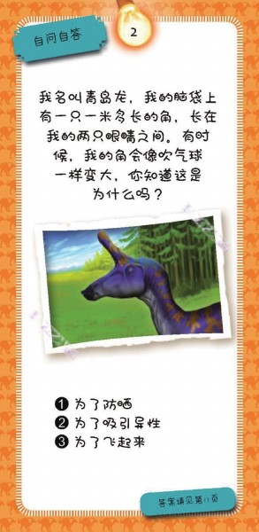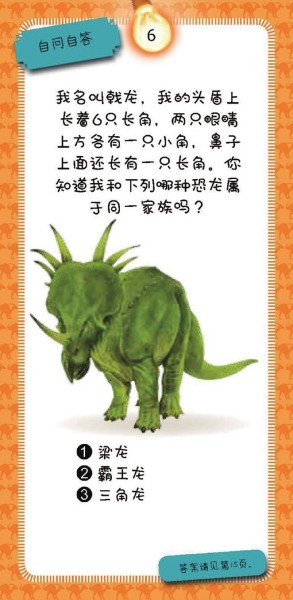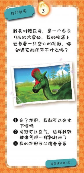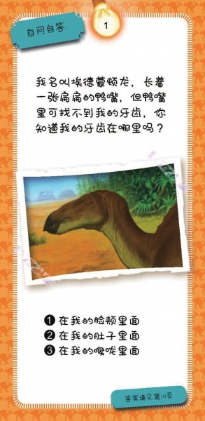 盒中包含有100个这样的趣味问题和一本答案书!100个趣味问答来自七大类恐龙,分别是:健步如飞的恐龙、聪明非凡的恐龙、长角尖刺的恐龙、凶狠残暴的恐龙、巨大无比的恐龙和千奇百怪的恐龙等。