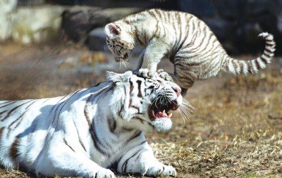 近日,一组动物熊孩子“欺负”妈妈的照片在网上走红。让大家见识到了不分国界,不分物种,熊孩子遍布世界的威力! 俄罗斯,一只不安分的虎宝宝一直“骚扰”想要打盹的妈妈,最后终于把妈妈惹怒了。这只精力旺盛的小老虎被拍到疑似“暴走”的画面,它不断地跳上跳下,在妈妈脸上又抓又踩。最后,虎妈妈终于忍无可忍,发出怒吼! 新加坡当地动物园两只三个月大的狮宝宝在妈妈身边转悠玩耍,其中一个小家伙调皮地咬住妈妈的尾巴,痛得狮妈大叫。 两头15个月大的棕熊宝宝在草地上打闹着玩耍,结果熊哥哥玩过了火,朝妹妹屁股上咬了一口。当妈妈安慰熊妹妹时,熊哥哥竟然还调皮地冲妹妹吐舌头做鬼脸。
