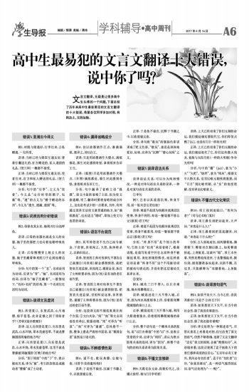 文言文翻译,无疑是让很多高中生头疼的一个问题,下面总结了历年来高中生最容易犯的文言文翻译的十大错误,希望各位同学多加对照,有则改之,无则加勉。 错误1:混淆古今译义 例1:时既与梁通好,行李往来,公私赠遗,一无所受。 误译:当时已经与梁国互通友好,背着行囊送礼的,官方赠送的、私人遗留的礼品,(贺兰祥)一概都不接受。 正译:当时已经与梁国互通友好,使者往来,官方和私人赠送的礼品,(贺兰祥)一概都不接受。 分析:句中的“行李”,古义为“使者”;今义是“出行时带的箱子、包裹”等。“遗”的古义为“赠予赠送的东西”,今义为“遗失、遗漏、遗留”等。 错误2:词类活用分析错误 例2:母徐衣其女衣,袖利刃行向池呼鱼。 误译:后母的衣服也就是女儿的衣服,袖子里的那把刀也向着池塘呼唤鱼儿。 正译:后母慢慢穿上她女儿的衣服,袖子里藏着锋利的刀子走到池塘边呼唤鱼。 分析:句中的第一个“衣”,名词活用为动词,应译为“穿”;“袖”,名词活用为动词,应译为“袖子里藏着”。一般情况下,“名词+名词”的结构,第一个名词往往活用为动词。 错误3:误译文言虚词 例3:西望夏口,东望武昌,山川相缪,郁乎苍苍,此非孟德之困于周郎者乎?(苏轼《前赤壁赋》) 误译:这儿向西望是夏口,向东望是武昌,山水环绕,草木茂盛苍翠,不就是曹操围困周瑜的地方吗? 正译:向西望是夏口,向东望是武昌,山水环绕,草木茂盛苍翠,这里不就是曹操被周瑜围困(打败)的地方吗? 分析:“困于周郎”中的“于”字,表示被动关系,译为“被”,考生的忽视造成被动者“曹操”成了主动者。 错误4:漏译省略成分 例4:但以浓墨洒作巨点,淋漓满纸。郭异之,持以白王。 误译:只是用浓墨洒作大墨点,满纸都是。郭生对此感到奇怪,拿着纸来告诉王生。 正译:(狐狸)只是用浓墨洒作大墨点,(弄得)满纸都是。郭生对此感到奇怪,拿着纸来告诉王生。 分析:句中漏译了省略主语“狐狸”。原文中虽然省略了主语,但为使文意通顺、明了,翻译时要将省略的成分补上。这也是考试中的一点要求。另外,有些通过直译无法使文意贯通的地方,如“满纸都是”,也应适当“增词”,即加上使文句连贯的词语。 错误5:语言不合规范 例5:其军帅怒贲不先白己而专献金,下贲狱。世祖闻之,大怒,执帅将杀之,以勋旧而止。 误译:贺贲的主帅对他事先不禀告自己就擅自(向世祖)献金感到愤怒,就把贺贲关进监狱。世祖闻之,眼冒金星,执住了主帅将要杀他,因为(他)是有功的老臣而作罢。 正译:贺贲的主帅对他事先不禀告自己就擅自(向世祖)献金感到愤怒,把贺贲关进监狱。世祖听说这事,非常愤怒,逮捕了主帅将要杀他,因为(他)是有功的老臣而作罢。 分析:这段译文的不规范表现在两个方面:①文白夹杂,“闻”“执”等文言词语没有译出。根据语境,“闻”可译为“听说”;“执”可译为“逮捕”。②风格不一致,整体上看是严肃的书面语,而“眼冒金星”显然是口语化的。 错误6:不辨感情色彩 例6:遂不仕,耽玩典籍,忘寝与食。(《晋书·皇甫谧列传》) 误译:于是他不做官,沉湎于书籍之中,以致废寝忘食。 正译:于是他不做官,沉醉于书籍之中,以致废寝忘食。 分析:译句将“耽玩”的褒扬色彩误译成了贬义色彩。“耽玩”,意思是深深地爱好、玩味,应译为“沉醉”“潜心玩味”之义。 错误7:误译语法关系 误译语法关系,可以分为两种情况,一种是对单句语法关系的误译,一种是对复句语法关系的误译。 ①单句 例7:岂非以其流落饥寒,终身不用,而一饭未尝忘君也欤? 误译:难道不是因为他颠沛流离忍饥受寒,终身不利用,却连一餐饭都不曾忘记(报效)君王吗? 正译:难道不是因为他颠沛流离忍饥受寒,终身不被重用,却连一餐饭都不曾忘记(报效)君王吗? 分析:“终身不用”是个短小的单句,它的主语“杜甫”承前省略了。根据语境,是叙写杜甫空怀壮志而终身不被朝廷重用,身处困境的情状,而这种意思却是靠“终身不用”这个不用被动词的被动句表达的,并没有把这层被动关系译出来。 ②复句 例8:贼攻三日不得入,以巨舟乘涨,缘舟尾攀堞而上。 误译:贼寇进攻三天不得入城,后来,因为河水高涨船体上浮,沿着船尾攀爬城墙的垛口上去。 正译:贼寇进攻三天不得入城,利用大船趁着涨水,沿着船尾攀爬城墙的垛口上去。 分析:整个语句是一个顺承关系的复句,而“以巨舟乘涨”中的“以”字,是表示凭借的介词,应译为“利用”。误认为表示因果关系的连词,译为“因为”,将整个语句的结构关系误译为因果关系。 错误8:不懂文言修辞 例9:天既讫汝元命,我朝实代之。汝爝火馀烬,敢与日月争明邪! 误译:上天已经结束了你们元朝的命运,我们朝廷确实要取代它。你们即使点燃了自己,也没有日月一样的光明! 正译:上天已经结束了你们元朝的命运,我们朝廷取代了它。你们这些微火残灰,竟敢与太阳月亮(一样的大明朝)争夺光明吗! 分析:句中的“爝”(jué),意为“小火”“火把”,“馀烬”,意为“残灰”,根据文中人物关系,这里比喻元朝残将脱脱;而“日月”则比喻明朝。从“实”的角度理解,没有译出比喻意义。 错误9:不懂古代文化常识 例10:项王按剑而跽曰:“客何为者?”(司马迁《鸿门宴》) 误译:项王握住剑把站起来,大声问:“来客是什么人?” 正译:项王握着剑把直起腰来,问道:“来客是干什么的?” 分析:古人席地而坐,而两膝着