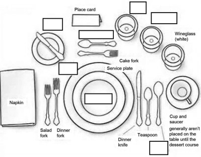 一、根据背景文章回答 ( ) 1. In Arabic countries you must be careful with your _____. A. feet B. mouth C. eyes D. hands ( ) 2. In Britain we try not to put our hands _____ during a meal. A. on the desk B. in the bed C. on the table D. in the pocket ( ) 3. Which of the following is true? A. In different countries, the manners are the same. B. Different countries have different manners. C. Good manners are not important. D. In Arabic countries we mustn’t be careful with our hands. ( ) 4. What’s the meaning of the underlined word “throughout”? A. 在……方面 B. 在……期间 C. 在……地方 D. 在……里面 ( ) 5. The main idea of this passage is _____. A. manners B. habits C. traffic D. lights 二、配对下列英语单词及中文含义 fork 菜肴 knife 甜点 plate 汤匙 dessert 刀 glass 叉 spoon 茶匙 course 盘子 teaspoon 玻璃杯 三、根据下列文章,将图片信息填写完整 Laying the Table Cutlery (餐具) Put forks on the left, and knives and soup spoons on the right. The different knives and forks are for the different courses. The small knife and fork are for the first course; the big ones are for the main course, and the small knife on the small plate is for butter or cheese. As a general rule, when you eat you start on the outside and move into the plate. The spoon and small fork at the top are for dessert. Plates The small plate is for bread and is always on the left. In the middle, there are usually some plates, and the smallest one is for salad. Glasses There are usually at least two glasses. They are on the tight, above the knives. They are water glass and wineglass.