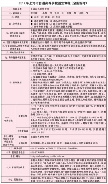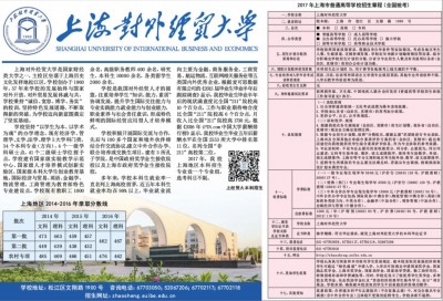 上海对外经贸大学是国家财经类大学之一,主校区坐落于上海历史文化发祥地松江区。学校创办于1960年,57年来学校的发展始终与国家对外开放、对外贸易发展休戚与共,学校秉持“诚信、宽容、博学、务实”的校训,坚持特色发展道路,不断取得新的突破,为学校迈向新蓝图奠定了坚实基础。 学校坚持“以学生为本、以学术为魂”的办学理念,现有经济学、管理学、文学、法学、理学5大学科门类,34个本科专业(方向),4个一级学科硕士点,41个二级硕士学位授予点。学校建有国家级实验教学示范中心、国家级人才培养模式创新实验区、国家级本科大学生创业教育基地。国际经济与贸易、英语、金融学、物流管理、工商管理为教育部特色专业建设点。学校现有教职工1000余名,高级职务教师400余名,研究生、本科生10000余名,各类留学生2000余名。 学校是我国对外经贸人才的摇篮,注重培养学生“知识、能力、素质”协调发展,提升学生国际交往能力与专业实践能力,就业能力与创业能力,职业素养与社会责任意识,形成特色鲜明的国际经贸应用型人才培养模式。 学校积极开展国际交流与合作,先后与100多个国家和境外伙伴缔结合作交流协议,建立中外合作办学、联合培养或交换生项目。建有3所孔子学院,是中国政府奖学金生接收院校以及上海市政府奖学金生接收院校。 多年来,学校本科生就业率一直名列上海高校前茅,近五年本科生就业率均在98%以上,毕业就业流向主要为金融、商务服务业、工商贸易、航运物流、互联网相关服务业等五类国内外优秀企业。根据麦可思数据有限公司的《2015届毕业生毕业半年后跟踪调查》显示,我校毕业生毕业半年后的现状满意度比全国“211”院校高 10个百分点,工作与职业期待吻合度比全国“211”院校高6个百分点,月收入比全国“211”院校高1730元。根据《2016年iPIN.com中国大学薪酬排行榜》显示,我校毕业生毕业五年后薪酬水平在全国2553所大学中排名第11位,名列全国“非211”高校第二位。 2017年,我校上海地区本科招生专业设一个专业组,选考科目不限。 学校地址:松江区文翔路1900号 咨询电话:67703050;52067206;67702117;67702118 招生网址:zhaosheng.suibe.edu.cn