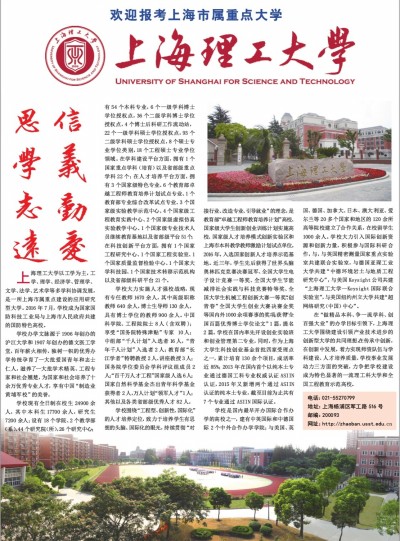 上海理工大学以工学为主,工学、理学、经济学、管理学、文学、法学、艺术学等多学科协调发展,是一所上海市属重点建设的应用研究型大学。2016年7月,学校成为国家国防科技工业局与上海市人民政府共建的国防特色高校。 学校办学文脉源于1906年创办的沪江大学和1907年创办的德文医工学堂,百年薪火相传,独树一帜的优秀办学传统孕育了一大批爱国青年和志士仁人,滋养了一大批学术精英、工程专家和社会翘楚,为国家和社会培养了十余万优秀专业人才,享有中国“制造业黄埔军校”的美誉。 学校现有全日制在校生24900余人, 其中本科生17700余人, 研究生7200余人;设有18个学院、2个教学部(系),44个研究院(所),26个研究中心;有54个本科专业,6个一级学科博士学位授权点,36个二级学科博士学位授权点,4个博士后科研工作流动站,22个一级学科硕士学位授权点,93个二级学科硕士学位授权点,8个硕士专业学位类别,18个工程硕士专业学位领域。在学科建设平台方面,拥有1个国家重点学科(培育)以及省部级重点学科22个;在人才培养平台方面,拥有3个国家级特色专业、6个教育部卓越工程师教育培养计划试点专业、1个教育部专业综合改革试点专业、3个国家级实验教学示范中心、4个国家级工程教育实践中心、2个国家级虚拟仿真实验教学中心、1个国家级专业技术人员继续教育基地以及省部级平台51个;在科技创新平台方面,拥有1个国家工程研究中心、1个国家工程实验室、1个国家质量监督检验中心、1个国家大学科技园、1个国家技术转移示范机构以及省部级科研平台21个。 学校大力实施人才强校战略,现有专任教师1670余人,其中高级职称教师640余人,博士生导师130余人,具有博士学位的教师900余人。中国科学院、工程院院士8人(含双聘);享受“国务院特殊津贴”专家 10人;中组部“千人计划”入选者16人,“青年千人计划”入选者2人;教育部“长江学者”特聘教授2人、讲座教授3人;国务院学位委员会学科评议组成员2人;“百千万人才工程”国家级人选6人;国家自然科学基金杰出青年科学基金获得者2人,万人计划“领军人才”1人;其他以及各类省部级优秀人才82人。 学校围绕“工程型、创新性、国际化”的人才培养定位,致力于培养学生有思想的头脑、国际化的眼光,持续贯彻“对接行业、改造专业、引导就业”的理念,是教育部“卓越工程师教育培养计划”高校、国家级大学生创新创业训练计划实施高校、国家级人才培养模式创新实验区和上海市本科教学教师激励计划试点单位。2016年,入选国家创新人才培养示范基地。近三年,学生先后获得了世界头脑奥林匹克竞赛决赛冠军、全国大学生电子设计竞赛一等奖、全国大学生节能减排社会实践与科技竞赛特等奖、全国大学生机械工程创新大赛一等奖“、创青春”全国大学生创业大赛决赛金奖等国内外1000余项赛事的奖项;获得“全国百篇优秀博士学位论文”1篇,提名2篇。学校在国内率先开设创业实验班和创业管理第二专业,同时,作为上海大学生科技创业基金首批四家受理点之一,累计培育130余个项目,成活率近85%;2013年在国内首个以纯本土专业通过德国工科专业权威认证ASIIN认证,2015年又新增两个通过ASIIN认证的纯本土专业,截至目前为止共有7个专业通过ASIIN国际认证。 学校是国内最早开办国际合作办学的高校之一,建有中英国际和中德国际2个中外合作办学学院;与美国、英国、德国、加拿大、日本、澳大利亚、爱尔兰等20多个国家和地区的120余所高等院校建立了合作关系,在校留学生1000余人。学校大力引入国际创新资源和创新力量,积极参与国际科研合作,与,与英国精密测量国家重点实验室共建联合实验室,与德国亚琛工业大学共建“中德环境岩土与地质工程研究中心”,与美国Keysight公司共建“上海理工大学—Keysight国际联合实验室”,与美国纽约州立大学共建“超网络研究(中国)中心”。 在“做精品本科、争一流学科、创百强大业”的办学目标引领下,上海理工大学围绕建设引领产业技术进步的创新型大学的共同理想,在传承中创新,在创新中发展,着力实现师资队伍与学科建设、人才培养质量、学校事业发展动力三方面的突破,力争把学校建设成为特色显著的一流理工科大学和全国工程教育示范高校。 电话:021-55270799 地址:上海杨浦区军工路516号 邮编:200093 网址:http://zhaoban.usst.edu.cn