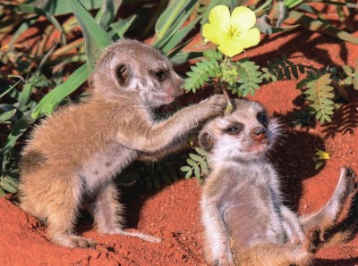 两只可爱的猫鼬宝宝在一起玩耍时被人拍到,其中一只小猫鼬见身后有朵黄色的小花,便拉着花茎把它“戴”在了小伙伴的头上。