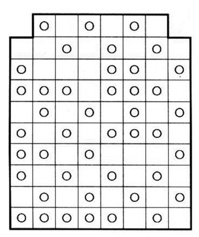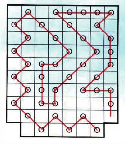 请你一笔把所有的圆环串连起来,可横向、竖向、斜向进行,但不能重复串连,而且线路要最短,你行吗?