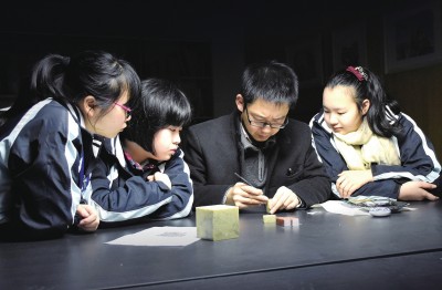 说明:篆刻是汉字特有的艺术形式,迄今有三千七百年的历史。作品用暗背景描述篆刻文化深厚的文化底蕴,关掉被摄主体背后的灯,用顶灯照亮示范老师和观摩的学生,使被摄主体更加凸显。作品聚焦在刻章的刀锋上,主题更加鲜明。
