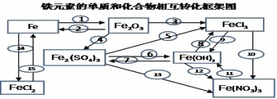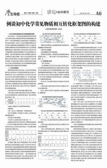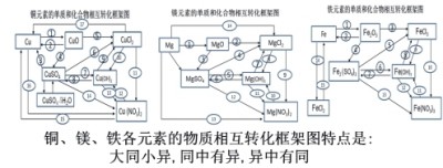 一、初中化学常见物质相互转化框架图构建的背景 化学学科的一个突出特点就是物质种类的多样性和它们之间的关联性,有的联系非常明显,有的则很隐蔽;化学学科中一条非常重要的核心思想就是物质之间能够相互转化,而转化需要一定条件。无论是对物质的梳理还是对化学核心思想的渗透,这都需要教师引导学生去归纳总结和提炼,而物质相互转化的框架图则是实现上述目的的重要载体和途径。教师在教学中进行活动设计,通过引导学生构建物质转化的框架图,则既能让学生加深各物质之间的联系, 又能对常见物质进行归纳、巩固和整合,还能向学生渗透有关元素化合物的一种学习方法,体会到化学中的物质之间是相互联系、相互转换且转换需要一定条件的学科思想。不仅如此,通过这样的方式教学,还能充分调动学生学习的主动性和创造性,让学生的创新精神和创造能力在教学实践中得到很好的培养和提高。 二、活动过程描述 物质的性质和相互转化是初三化学复习阶段的重要内容,也是贯穿初中化学教学的重要内容,该内容由于物质种类多、知识点分散导致学生学习时存在很大困难。而初中化学所出现的常见物质中,有一些元素形成的物质彼此之间存在很密切的联系,因此它们之间能形成比较完整的物质转换框架图。例如铜元素形成的单质及其常见化合物能够形成比较完整的相互转换框架图,铜、铁、镁、碳、氢等也如此,通过引导学生设计物质相互转化框架图的构建。 示例:我们已经学过很多含铜元素的化合物。 1.请分别写出含铜元素的单质及其常见化合物的化学式并标出物质类别。(盐的种类不超过三种,后面框架图也不超过三种) 2.构建上述物质之间互相转变的框架图。 构建要求: ①用→表示从一种物质到另一种物质的转化 ②用(所需物质)/(所需条件)在箭头上注明转化所需的物质和条件 ③在箭头末端注明编号 3.写出符合上述转化的化学方程式各一个: 构建铜元素的单质及其常见化合物的框架图的第一个任务是写出铜元素的常见化合物化学式及其类别,同学们经过自己思考和小组讨论写出了下列含铜元素的单质及其化合物化学式。 由于圈定了物质,选好了转换的范围,且其中有些物质转换是比较容易想到的,因此各个层次和水平的学生都非常积极主动地构建物质转换的框架图。根据笔者观察,初次构建物质框架图的时候,有的同学构建的物质框架图虽欠完整但是很美观,有的同学构建的框架图很丰富但他们依然在绞尽脑汁地思考……整个班级的学生都兴致勃勃地在完成自己的设计作品。最终,经过师生共同合作,完成了铜元素的物质相互转换的框架图,见下图: 【获得信息1】根据上述构建的框架图,能够得出和硫酸铜相关的哪些性质? ①箭头指向硫酸铜 ②从硫酸铜出发指向别的物质 【获得信息2】通过上述物质转化框架图的构建,说明物质之间是______(填可以或不可以)转化的,但转化又需要一定______。 三、活动效果与反思 1.学生作品展示: 经过教师的引导,学生经过自己独立思考和小组合作(必要的时候需要教师的指导)下,能够从闻所未闻到初步学会,从需要小组合作甚至教师帮助到自己独立完成,构建的物质转换框架图从不完整、不美观到逐步完整和设计美观,学生的合作意识和创新意识得到了显著的提升。学生在铁元素物质相互转化的框架图上,又陆续构建了下列物质转换框架图。 学生作品1: 铁元素的单质和化合物相互转化框架图的构建 分别写出铁元素的单质及其常见化合物的化学式并标出物质类别。 (提示:铁的化合物不考虑氢氧化亚铁和硫酸亚铁、硝酸亚铁) 写出含铁元素的物质相互转换需要的物质的化学式 :(1)______(2)______(3)______(4)______(5)______(6)______(7)______(8)______(9)______(10)______(11)______(12)______(13)______(14)______(15)______ 学生作品2: 镁元素的单质和化合物相互转化框架图的构建 分别写出镁元素的单质及其常见化合物的化学式并标出物质类别。 (提示:比镁活泼的金属一般都和水反应,不考虑氧化镁转换成镁,也不考虑金属把镁从溶液中置换出来的转换) 写出含镁元素的物质相互转换需要的物质的化学式 : (1)______(2)______(3)______(4)______(5)______(6)______(7)______(8)______(9)______(10)______(11)______(12)______(13)______(14)______ 2.学生在构建物质框架图过程中摸索出一些构建的规律和技巧。 在引导学生构建物质转换框架图的过程中,由于物质相互转换的次数是很多的,这么多的转换在框架图中既要完整地体现出来又要保持美观,让学生独立完成的确存在比较大的难度,但是很多学生很轻松地完成了镁、铁、钙、碳元素构成物质的转换框架图, 这的确让笔者很惊讶!问其原因,原来他们是按着课堂上老师所示范的构建铜元素物质转换的框架图的“套路”来完成的,这又让笔者惊喜和惊叹!原来上述物质框架图的构建过程中,虽然元素和物质不同,但方法往往是大同小异!可以从下图对照中找出规律: 从三张图对比中可以看得出来,铜、镁、铁三种元素各自框架图的“套路上”存在明显的“大同”:首先从各元素的单质作为起点;接着,考虑单质先和氧化物能否进行转换;再接着,考虑氧化物和盐酸盐能否进行转换;再接着,把盐酸盐、硫酸盐和硝酸盐按正三角形的位置进行分布,考虑三者之间能否进行转换;再接着,把碱放在三种盐的中间位置,考虑能否与三种盐进行