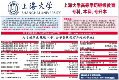 上海大学高等学历继续教育专科、本科、专升本 上海大学是国家“211工程”重点建设的综合性大学,学科门类齐全。近年来,上海大学继续教育学院依托学校的学科优势及雄厚的师资力量,曾先后荣获上海和全国成人高等学校招生工作先进集体及上海市成人教育先进集体等荣誉称号。2017年成人高考报名在即,为帮助考生解读政策、选择专业、填报志愿,上海大学继续教育学院将于2017年7月2(周日)上午9:00—下午15:00在校本部延长、新闸、宝山和嘉定校区同时举办招生咨询活动,欢迎广大考生来校咨询。 招生专业: 广告学(会展管理方向)、艺术设计、视觉传达设计、视觉传达设计(平面广告)、视觉传达设计(室内设计)、视觉传达设计(多媒体设计与制作)、广播电视编导、工商管理、会计学、国际经济与贸易、金融学、物流管理、国际商务、人力资源管理、工程管理、英语、日语、汉语国际教育、社会学、通信工程、电子信息工程、机械工程、微电子学科学与工程、计算机科学与技术 招生咨询电话:56338184、56337741 网址:www.cce.shu.edu.cn 为方便学生就近入学,全市各区设有多处教学点! 上海大学校本部 上海大学延长校区:静安区 延长路149号 Tel:56331940 上海大学新闸校区:静安区 新闸路1220号 Tel:62156093 上海大学宝山校区:宝山 上大路599号 Tel:66135786 上海大学嘉定校区:嘉定区 城中路20号Tel:69982965 轨交1号线 静安区 江场三路238号Tel:56037216*8015 静安区 阳曲路421号 Tel:66972632 徐汇区 漕溪北路502号Tel:64863973 (另有轨交4、9号线) 黄浦区 北海路8号18楼Tel:61332312 (另有轨交2、8、10号线) 黄浦区 汉口路515号702室 Tel:61554298 (另有轨交2、8、10号线) 轨交2号线 长宁 江苏北路89号 Tel:62102783 (另有轨交11号线) 浦东 川沙新镇川环南路266号 Tel:58925906 轨交3号线 宝山区 牡丹江路301号Tel:56160166 虹口区 丰镇路122号 Tel:65259804 普陀区 曹杨路805号 Tel:62541170 (另有轨交4、11号线) 轨交5号线 闵行区 雅致路215号六楼 Tel:64136026 (另有轨交1号线) 轨交6号线 浦东新区 商城路1980号 Tel:60546100 浦东新区 浦东南路1630号-3 Tel:68671112 (另有轨交4号线) 浦东新区 大同路479号Tel:58610450 浦东新区 兰城路303号Tel:50384121 浦东新区 金桥路150号Tel:50381946 轨交7号线 宝山区 大华三路99号 Tel:36533260 轨交8号线 浦东新区 德州路240号Tel:68313477 (另有轨交6、7号线) 杨浦区 大连路846号 Tel:65045610 轨交9号线 松江区 秀水新路21号 Tel:57822906 闵行区 宝南路533号 Tel:63528705 轨交11号线 嘉定区 安亭镇于塘路885号 Tel:69576968 地铁13号线 嘉定区 江桥镇鹤旋路42弄7号2楼Tel:69992193 其它还有: 青浦区 公园路408号3楼Tel:69217528 浦东新区 南汇勤奋路21号一楼 Tel:68042488 校本部考前辅导电话: 56331940、62156093、69982965(嘉定)