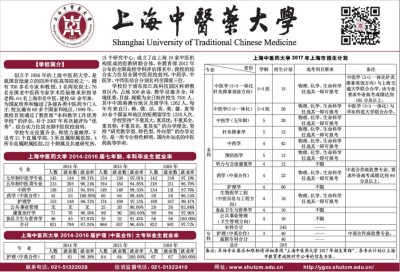 【学校简介】 创立于1956年的上海中医药大学,是我国首批建立的四所中医高等院校之一,拥有700多名专家和教授,3名两院院士,76名全国老中医药专家学术经验继承班指导老师,64名上海市名中医,建校60余年来,为国家培养和输送了各级各类中医药专门人才,校友遍布60多个国家和地区。1999年,我校首批通过了教育部“本科教学工作优秀学校”的评估,并于2007年再次被评为“优秀”。综合实力位居全国中医院校前列。 学校专业设置齐全,师资力量雄厚,下设有21个直属学院,3所直属附属医院,4所非直属附属医院,22个附属及共建研究所,15个研究中心;成立了由上海19家中医机构组成的医教研联合体。在教育部2012年公布的全国高校学科评估排名中,我校的综合实力位居全国中医院校前列,中药学、中医学、中西医结合分别名列全国前三位。 学校位于浦东张江高科技园区科研教育区内,占地500余亩,教学设施齐全,环境优美。目前,规模为全日制在校生7301人,其中中国港澳台地区及留学生1262人。每年有来自日、韩、俄、法、英、美、德、意等30余个国家和地区的短期留学生1235人次。 学校坚持“不重其大,重其优;不重其全,重其特;不重其名,重其实”的办学理念,坚持“研究教学型、特色型、外向型”的办学定位,是一所专业特色鲜明、国内外知名的中医药高等学府。 联系电话:021-51322028 投诉监督电话:021-51322410 网址:www.shutcm.edu.cn http://ygzs.shutcm.edu.cn/