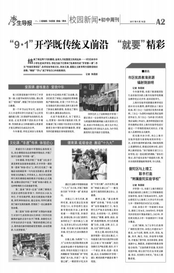结束了将近两个月的暑假,金秋九月校园里又热闹起来——9月1日本市中小学生迎来开学日。学校为孩子们带来了各具特色的“开学第一课”。作 为“传统优势项目”,各学校在传统文化、科技元素、爱国主义教育等方面表现依旧亮眼。“精彩”“开心”成了学生们口中的高频词。 记者 朱筱丽 爱国课:磨练意志 爱我中华 虹口区澄衷初级中学举行了开学第一课,以建军90周年为契机,精心策划了“爱国课”,增强了学生们对祖国的自豪感。 第一个环节由红军后代、退伍老兵王杰老师向学生们讲述了自己用坚强的毅力第二次勇闯罗布泊的经历。他说道,正是凭借整个团队的合作精神、坚韧的意志力和健康的心理素质才能支撑他们完成这次壮举。 今年暑假,学校足球队与青海果洛青少年足球队开展了友谊赛。队员们经历了球场上高温的炙烤和教练严格的训练。在第二个环节中,队长朱晓东代表全体队员和大家分享了参加比赛的感悟。他表达了要向军人看齐,磨练意志的志向。 光说不练假把式,有了爱国之心,更要有一身本领才能保家卫国。学校邀请了虹口消防中队的官兵们现场教授全体中预年级同学擒敌拳,希望同学们能够练好身体报效祖国。 同学们在上了这特殊的开学第一课后表示一定会将革命军人的意志力与顽强拼搏的精神融入现在的学习生活,传承中华传统文化,树立为中华之崛起而努力学习的远大志向,为中华民族的伟大复兴做好全面准备。 文化课:“非遗”传承 体验匠心 黄浦区市八初级中学围绕弘扬传统文化,结合暑期活动总结和新学期动员,开展了别开生面的“开学第一课”。 今年暑期,学校开展了“非遗”文化亲子课堂和职业技能体验课程。在开学第一课的第一篇章“体验·匠心”上,师生们交流了一幅幅活动的画面和一句句真实的感言,感受着传统文化的魅力。开学典礼上,校艺术社团的师生利用暑期绘制的精美手绘墙也正式揭幕,泥塑社团还开设了“非遗”体验小课堂,以这种特殊的方式迎接新学期。 第二篇章“探寻·足迹”回顾了暑期在党团员老师们的带领下,同学们以小队为单位,手持实践护照,到各实践基地开展参观、探究和体验活动。通过活动,同学们感受到了城市发展的脉搏,更增添了一份自豪感和使命感。 第三篇章“启程·新学期”在预备年级新生对初中生活的热切向往和初三同学们的激情洋溢的话语中拉开了帷幕,章健校长在开学动员讲话中说道:“精彩的假期已经过去,期待我们新学期的课堂更精彩,活动更精彩,生活更精彩。” 德育课:砥砺奋进 喜迎“十九大” 嘉定区金鹤中学围绕迎接“十九大”为主体,开展了精彩纷呈的“开学第一课”系列活动。 幸福之门:学生代表、教师代表、家长代表自发来到学校门口,向学校师生致以新学期问候并送上新学期祝福——师恩书签、幸福存折。拿着礼物,步入校门的师生如同经过了一座幸福之门,因为,这里有心灵与心灵共鸣的幸福,有灵魂与灵魂共振的幸福,有生命与生命共舞的幸福。 自强之路:为展现“十八大”以来伟大祖国取得的光辉成就和金鹤中学取得的可喜成果,学校在校园主干道左右两侧陈列“国家展板”和“学校展板”各六块,开辟了一条“自强之路”。一眼望穿137亿光年的“中国天眼”;站在世界之巅的“神威太湖之光”……激发起学生强烈的民族自信心、自豪感。 精神之墙:“嘉定教师精神”宣传墙、“学校六自精神”宣传墙巍然伫立,每位师生庄严地在宣传墙上签名留念。未来的每一天,老师们将铭记“博雅、睿智、淡泊、亲和”的教师精神;学生们将遵循“自信、自强、自律、自主、自助、自足”的学生品质。 时光之箱:高红校长升起新学期第一面五星红旗后,六年级新生将书信《致四年后的自己》放入“时光邮箱”。他们仿佛在无声地宣誓:现在,许下一个诺言,将来,收获一段美丽。此后,全场唱响《开学第一课》,嘹亮的歌声激荡在整个校园。