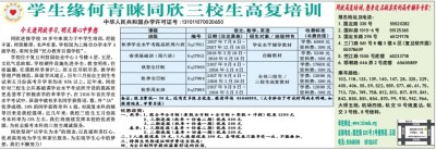 今天进同欣学习,明天圆心中梦想 同欣进修学校30多年来致力于中学生培训,经验丰富,师资雄厚,名声卓著。学校现为上海市办学水平A级学校,荣列全国“民办教育百强学校”。 学校位于复旦科技园创业中心2号楼4层、五层,文化气息浓郁。学校硬件设施先进齐全,教室明亮,住宿温馨;任课教师享誉沪上,班主任尽职尽责,教学和管理严格规范,班级学风端正。历年三月份自主招生考试和五月份高考升学率均在95%以上。近年来,同欣针对三校生公共基础课学业水平考试所开设的提高班更是荟萃了积极求学的莘莘学子。在2016年首次学业水平考试中,班级中就有多名同学获得语、数、外“3A”优异成绩,30%的同学获得单科A级。对高复本科的辅导历来是我校强项,近几年来,我校三校生五月份高考本科率为15%左右。我们将继续发挥本校的优质资源,为有志报考本科的三校生竭诚服务。 同欣坚持“以学生为本”的理念,以真诚和责任心,优质高效地为学生和家长服务。为实现学生心中的梦想,我们不懈努力! 优惠政策: 一、秋季: 1、报全年全日制(暑假全日制+全日制+寒假+冲刺)优惠1200元 2、三期连报(秋季+任意二期)优惠800元 3、二期连报(秋季+任意一期)优惠500元 春季: 1、三期连报(春季+任意二期)优惠300元 2、二期连报(春季+任意一期)优惠200元 二、3人连报优惠50元,5人连报优惠100元,各项优惠只能享受一次,不能叠加。 三、特困生凭街道证明学费适当优惠! 四、为全日制同学提供温馨舒适的住宿。 同欣高复培训,您身边名副其实的高考辅导专家! 报名地址及电话: 1.国定路335号 55520282 2.国和路1015-6号55125365 3.国定东路295号 65129178 4.三门路561号8幢3楼A区(复旦软件园) 55078609 5.控江路1555号底楼 65233718 6.邯郸路446弄2号底楼 65655859 乘车路线:102、118、133、139、140、147、28、325、329、405、406、55、59、522、559、577、60、61、75、713、726、749、758、812、813、817、819、841、842、850、851、854、870、99、910、942、966、大桥五线、机场四线、轨交10号线直达、轨交3号线、8号线转。 学校网址:www.txinedu.org 总部地址:国定路335号2号楼四层、五层 电话:65646999 65102487