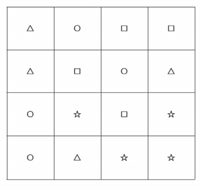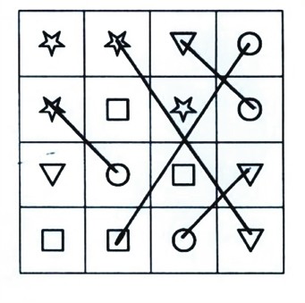 把每两个图形互换位置(共五次),要求每一横行、竖行都不出现相同的图形。想一想,应该怎样互换?