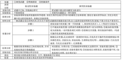 高中生物实验题按能力要求可划分为四大题型: (1)实验分析题型——根据提供的实验方案,分析其中的步骤、现象、结果,作出解答。 (2)实验方案的纠错或完善题型——对实验方案中的错误或不完善处,进行改正、补充,使实验方案趋于完善。 (3)实验设计题型(验证性实验;探究性实验)——根据题目提供的条件,自行设计实验方案。 (4)实验有关的综合类题型——以实验为背景,主要涉及代谢、遗传和生态相关知识。 所有实验设计的主要问题就是“六依托”,即细心审题、原理分析、材料分析、变量分析、结果分析和正确表达。 》》专题训练 1.为探究不同浓度的生长素对植物不同器官生长的影响。某同学进行了以下实验:将燕麦幼苗的胚根及芽末端4mm切去,再将剩余的10mm的胚根及胚芽每10条一组分别放入保持在25℃的不同浓度的生长素溶液中2天。(生长素溶液的浓度单位为mol·L^-1,浓度分别为10^-13、10^-12、10^-11、10^-10、10^-9……)请回答下列问题: (1)将胚根及胚芽的末端4mm切去的目的:____________。 (2)为什么要用10条一组而不是1条一组放入生长素溶液中进行实验____________。 (3)理论上,胚根、胚芽的最适宜生长素浓度分别是:____________。 (4)请你设计一个用于记录观察结果的表格。 参考答案: (1)胚根、胚芽的顶端都能产生生长素,去掉后能保证所配生长素浓度不受影响。 (2)较多数量一组可获得精确的平均结果 (3)胚根为10-10mol·L^-1 胚芽为10-1mol·L^-1 ★表格的设计技巧 要理清设计思路:①首先要读懂题目要求在表格“工作区”记录的内容。(题目中有明确的要求)②其次要明确表格的第一列写什么?第一行写什么?注意在第一列或第一行中肯定要写组别,即实验组和对照组(相互对照中组数可能更多)。③再绘制表格。 (切记:表格“工作区”是预留给所设计的实验中记录到的数据,而不是要学生造出数据来填入其中。因此只要设计完成一张空白表格即可。设计表格时,要先在草稿纸上画出表格轮廓,再写入答题纸中。)表格设计好后,切勿忘记给表格添上题注(即表格名称)。 2.为了验证甲状腺激素的生理作用,试以大白鼠的耗氧量和活动量为观察指标,请你根据给出的实验材料和用具、实验方法与步骤,预测实验结果,并作出分析。 材料和用具:日龄相同体重相近的雄性成年大白鼠两组,甲状腺激素溶液,蒸馏水,灌胃器,耗氧量测定装置,小动物活动测定仪等。(实验提示:给药途径为每日灌胃,给药剂量和仪器操作,不作考试要求,室温恒定)。 方法与步骤: (1)将两组雄性成年大白鼠分别标号为甲组和乙组,并分别用给出的仪器,测定与记录耗氧量和活动量。 (2)每日用灌胃器给甲组鼠灌入甲状腺激素溶液,给乙组鼠灌入等量的蒸馏水,饲养一定时期。 (3)测定与记录甲、乙组鼠的耗氧量和活动量。 结果预测与分析: 参考答案: (1)未给甲状腺激素时,甲、乙两组鼠耗氧量和活动量相近。 (2)给甲组鼠甲状腺激素后,其耗氧量和活动量均大于乙组鼠。 (3)结果表明甲状腺激素能促进新陈代谢,加速体内物质的氧化分解,提高神经系统的兴奋性,从而使动物的耗氧量和活动量增加。