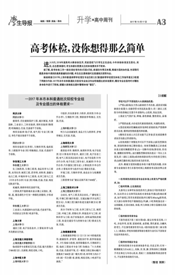 进入10月,2018年度高考大幕徐徐拉开,民航招收飞行学生正在启动,今年体检标准发生变化。其实,在志愿填报时,考生和家长需要关注的体检要求并不简单。 据了解,高考体检工作一般安排在每年的3月底4月初,根据往年情况来看,眼睛方面的如色盲、色弱等问题是体检中遇到的最具普遍性的问题,考生在志愿填报时应规避相关受限专业。 编者根据《2017年上海市普通高等学校招生专业目录》及《普通高等学校招生体检工作指导意见》梳理了两部分内容:2017年本市本科普通批次院校专业组及专业明确提出的体检要求;哪些专业在报考时对哪些身体条件进行了限制,提醒大家填报志愿时警惕体检“雷区”。 —2017年本市本科普通批次院校专业组及专业提出的体检要求— 同济大学 同济大学(1) 建筑学、历史建筑保护工程、城乡规划、风景园林、工业设计、工科实验班、理科实验班(物理类)明确规定,色盲、色弱者不予录取。 理科实验班(电子类、电气类)专业(类)规定,单色不能识别者不予录取。 同济大学(2) 理科实验班(化学类)、生物科学类、临床医学、口腔医学专业(类)明确规定,色盲、色弱者不予录取。 华东理工大学 华东理工大学(1) 化工制药类、生物工程类、食品科学与工程类、应用化学、制药工程、药学类、材料类、能源与动力工程、环境科学与工程类、化学工程与工艺(中外合作办学)专业(类)明确,色弱、色盲、嗅觉迟钝者不取。 机械类、物理学类色盲者不取。 计算机类不能准确在显示器上识别红、黄、绿、蓝、紫各颜色中任何一种颜色的数码、字母者不取。 华东理工大学(2) 工业设计、风景园林专业色弱、色盲者不取。 外国语言文学类口吃者不取。 上海大学 上海大学(1) 通信工程、电子信息技术、计算机科学与技术均要求无色盲。 上海交通大学医学院 上海交通大学医学院(1) 临床医学专业要求无色弱、色盲,镜片度数小于800度(含),无斜视、嗅觉迟钝、口吃。 上海中医大学 上海中医大学(1) 中医学、针灸推拿学、中药学、药学类(中外合作办学)、生物医学工程、预防医学等规定,无色弱、色盲。 上海中医大学(2) 听力与言语康复学、食品卫生与营养学、护理学规定,无色盲、色弱。 上海师范大学 上海师范大学(2) 教育技术学、物理学、地理科学类、电子信息类(含计算机科学技术、通信工程、电子信息工程、电气工程及其自动化专业)、电子信息类(中外合作办学,电子信息工程专业)、机械类(中外合作办学,汽车服务工程专业)、计算机类(中外合作办学,计算机科学与技术专业)要求无色盲。 环境工程、生物科学类、食品安全与检测要求无色弱。 工程管理专业“建议近视不高于800度”。 上海工程技术大学 上海工程技术大学(1) 自动化、电气工程及其自动化、广播电视工程、车辆工程(城市轨道)、交通运输(汽车运用工程方向)、车辆工程(城市轨道交通车辆方向)要求无色盲。 高分子材料与工程、化学工程与工艺、制药工程、环境工程、药物化学、焊接技术与工程、材料科学与工程、电子封装技术、材料成型机控制工程、轨道交通信号与控制专业(类)要求无色盲、色弱。 上海健康医学院 上海健康医学院(1)(2)(3)(4)中的临床医学;健康医学、护理学、康复治疗学;医学检验技术、卫生检验与检疫、医学影像技术;生物医学工程、临床工程技术专业(类)均规定:“六大类疾病,色盲、色弱者不取。任一眼视力矫正到4.8镜片度数高于800度(或一眼失明)者,两耳听力均小于3米(或一耳全聋)者,斜视、嗅觉迟钝、口吃者不宜就读。” 》》提醒 学校可以不予录取的六大疾病指的是: 1.严重心脏病(先天性心脏病经手术治愈,或房室间隔缺损分流量少,动脉导管未闭返流血量少,经二级以上医院专科检查确定无需手术者除外)、心肌病、高血压病。 2.重症支气管扩张、哮喘,恶性肿瘤、慢性肾炎、尿毒症。 3.严重的血液、内分泌及代谢系统疾病、风湿性疾病。 4.重症或难治性癫痫或其他神经系统疾病;严重精神病未治愈、精神活性物质滥用和依赖。 5.慢性肝炎病人并且肝功能不正常者(肝炎病原携带者但肝功能正常者除外)。 6.结核病除下列情况外可以不予录取:(1)原发型肺结核、浸润性肺结核已硬结稳定;结核型胸膜炎已治愈或治愈后遗有胸膜肥厚者;(2)一切肺外结核(肾结核、骨结核、腹膜结核等等)、血行播散型肺结核治愈后一年以上未复发,经二级以上医院(或结核病防治所)专科检查无变化者;(3)淋巴腺结核已临床治愈无症状者。 此外,眼睛方面的问题是体检中最常见的问题,具体到专业请相关考生在报考时到上海教育考试院官网去查询。 一些特殊性的院校或专业在体检上有更为严格的要求,如: ○报考军事、公安类院校 凡报考公安和军队院校的考生,除执行《指导意见》外,还应符合公安和军队院校对身体条件提出的相应要求。如不接受乙型肝炎表面抗原(外文缩写:HbsAg)阳性者,对大部分高等学校不限制的足(甲)癣、口吃等现象也有一定的限制,尤其对身高、体重、听力和视力等方面都有具体的标准。 ○报考教育学类专业 《指导意见》第三部分第8条,建议有嗅觉迟钝、口吃、步态异常、驼背、面部疤痕、血管瘤、黑色素痣、白癜风的考生,不宜报考教育学类专业;《指导意见》第二部分第1、2、3条指出,学校体育教育等部分教育专业可以不录取有