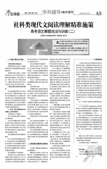 本文主要以社科类现代文为例,拟从三方面来讲练:筛选、整合文中信息;概括部分或整体的文章内容;概括说明对象的特征或规律。 以上三方面知识点,所占分值较大,既是重点、难点,又是考生失分的“重灾区”,因而,考生应格外关注和重视,力争有所突破。 (一)筛选、整合文中信息 1.筛选与整合信息的含义 所谓筛选信息,就是从一定的阅读目的出发,通过辨别把相关的信息提取出来。 所谓整合信息,就是从一定的阅读目的出发,将文中相关的而又分散的信息归集起来,并加以处理。可见,“整合信息”和“归纳内容要点”、“概括作者的观点态度”等考点之间是交叉关系,而不是并列关系。 2.筛选与整合信息的手段与要求 从所给的阅读材料中区分有关的与无关的、主要的和次要的、关键的与非关键的词语、句子、段落等,筛选并整合出自己所需要的或适合要求的信息,是达到阅读目的,获得所需信息的重要手段。从文章中筛选并整合重要信息,必须在阅读时把注意力放到文章的重要内容上。 3.一段或一篇文章重要的信息有哪些,又如何获取呢? 主要包括以下三条路径: ①从文章的基本概念与新的知识中获取信息 从近年高考题型来看,以考查筛选、整合信息为主要目的社科类文章的阅读,几乎没有不考查对文章基本概念与新知识的理解的。所以,在阅读中要非常重视对文章基本概念与新知识的理解与考查。 ②对重要概念和知识的解释和阐述 对文中所涉及的重要概念和知识,作者会加以深入浅出的解释和阐述,特别是不太常见的概念和新知识,以便读者能够正确地认知和理解。抓住这些阐释的内容,对解答有关题目至关重要。 ③从重要的句子中获取信息 显而易见,除了上述所说的文中的概念句属于重要的句子之外,还包括能够集中表述作者观点态度与写作意图、介绍某种情况或集中反映文章主旨的句子,以及那些结构复杂、信息量大的句子。 ④从运用的材料中获取信息 材料是文章的“血肉”,也就是说,写文章离不开材料。作者所运用的材料,一定是明示着或隐含着某些信息。阅读者要把它们筛选出来,是阅读应该完成的任务之一,自然也是获取信息的有效途径。 简言之,重要信息的筛选包括:摘要抽取、概括、组合、转换、延伸等能力。 ⑤怎样整合信息 所谓整合信息,就是把分散的信息集中起来,把零碎的信息加以条理化、系统化,这样方可对阅读材料有更深一层的理解,获得更有价值、更有意义的东西。 在高考试题中,许多阅读题的正确解答,都需要作这样的整合。如2016年第3题:概括“法官”式文学批评的特点。对于这样的试题,首先要把文中相关的材料、语句筛选出来,然后再加以分析、归纳,即进行整合,才能作出正确的回答。 ⑥筛选、整合文中信息应注意的事项 首先,提取的信息要精准:一是分清主要信息和次要信息;二是满足试题需要,包括筛选和整合的角度,归纳的要点,都要正确。 其次,要准确理解文章语言:要特别注重准确理解阐释基本概念、介绍事物属性的语句。准确理解表述作者见解、观点或传递新知识的语句。 (二)概括部分或整体的文章内容 在试卷中,概括部分或整体的文章内容题都有。 概括部分文章内容,主要分三种情况:其一,就是概括某段的内容,也就是通常所说的概括段义,只要把该段主要内容用自己的话或文中恰当的话表达出来即可;其二,是概括某几段的内容,这时,就采用“叠加法”,把各段意思合并即可;其三,概括整体的文章内容,即文章的中心,可以通过文题、议论抒情句等来提取、完成。 对于上述的第三点,即概括整体的文章内容,要力避“只见树木,不见森林”的情况发生,为此,应在整体感知的基础上完成本项工作。即在阅读一篇文章时,要从整体到部分再到整体,即初读文章,了解大意后,再理解字词,读懂每句话,给文章分段和归纳段意,最后回到文章整体上来,进而抓住文章的主要内容,并概括出文章的主要内容。 概括文章的主要内容,就是要搞清楚全文主要讲的是什么。只有掌握了文章的主要内容,才能正确领会文章的中心思想。文章的主要内容,一般应概括得完整简要。概括文章主要内容的方法有: 1.标题追溯法。有些以内容命题的文章,就可以根据标题去阅读,追溯文章的主要内容。 2.段意叠加法。因段落大意概括了一段的主要内容,将每段大意综合起来,加以概括,就是整篇文章的主要内容。这是最常用的方法。用这种方法应注意两点:第一,各段大意之间,有的要加上一些过渡词语,以便读起来通顺连贯。第二,要区分重点段落和非重点段落,做到有详有略,有的甚至可以舍去。 3.问题概括法。作者写一篇文章,往往是围绕一个主旨,抓住几个问题,按一定的顺序写的。因此,在读一篇文章时,想一想作者所要说明的是哪几个问题?把这几个问题概括起来,就是文章的主要内容。 4.借助句段法。即借助文章中的句或段来总结主要内容。 总之,不管运用哪种方法,都必须先认真阅读文章,分析理解,在此基础上,才能正确概括文章的主要内容。同时,各种方法结合运用,效果更好。 》》思维体操 1.以泰山300兆瓦压水堆核电站为例,核蒸汽供应系统(一回路系统)主要由反应堆、蒸汽发生器、主泵、稳压器等组成。气轮发电机系统(二回路系统)主要由汽轮发电机组、凝结水系统、给水系统等组成。泰山300兆瓦压水堆核电站的一回路系统与