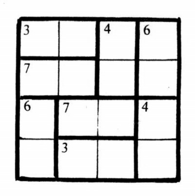 请你在空格里面,分别填入一个数字,要求每一横行、竖列都不出现相同的数字,并且要使左上角的数字,等于粗框内所填数字的总和。
